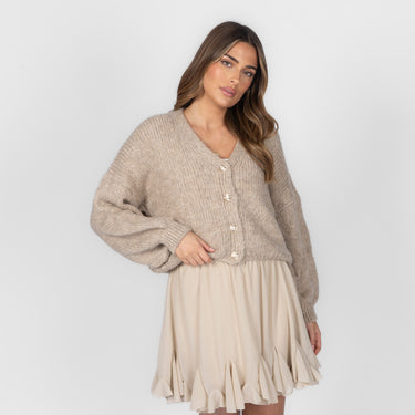 Der CozyGlam V-Cardigan Short vereint zeitlose Eleganz mit maximalem Kuschelfaktor. Sein tiefer V-Ausschnitt sorgt für eine feminine Note, während die weiche Strickqualität ein luxuriöses Tragegefühl garantiert. Die Oversize-Passform macht ihn besonders bequem und vielseitig kombinierbar – ob casual mit Jeans oder schick über einem Kleid.
