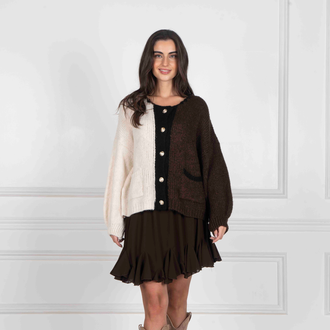 Unser Coffee & Cream Knit vereint zwei warme Lieblingsnuancen in einem stylischen Look. Der weiche Grobstrick in Creme und Dunkelbraun sorgt für ein harmonisches Farbspiel und einen modernen, cozy Vibe. Die goldenen Knöpfe und die lockere Passform machen ihn zu einem echten Statement-Piece – lässig, edel und unglaublich bequem.