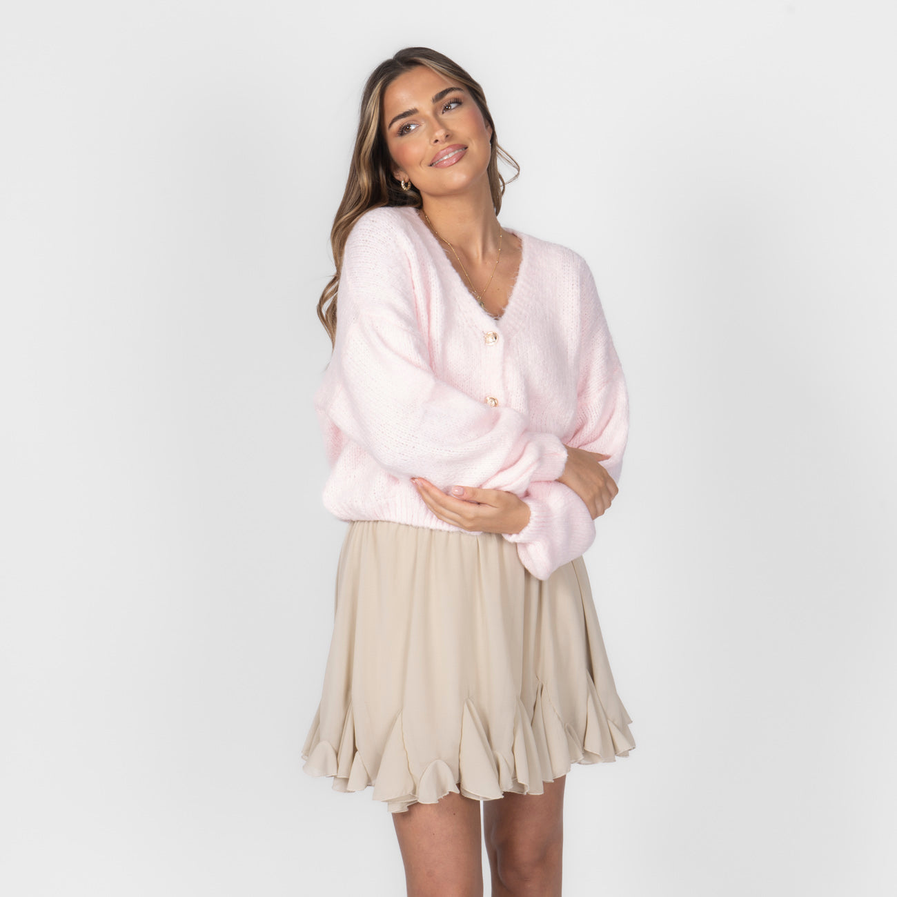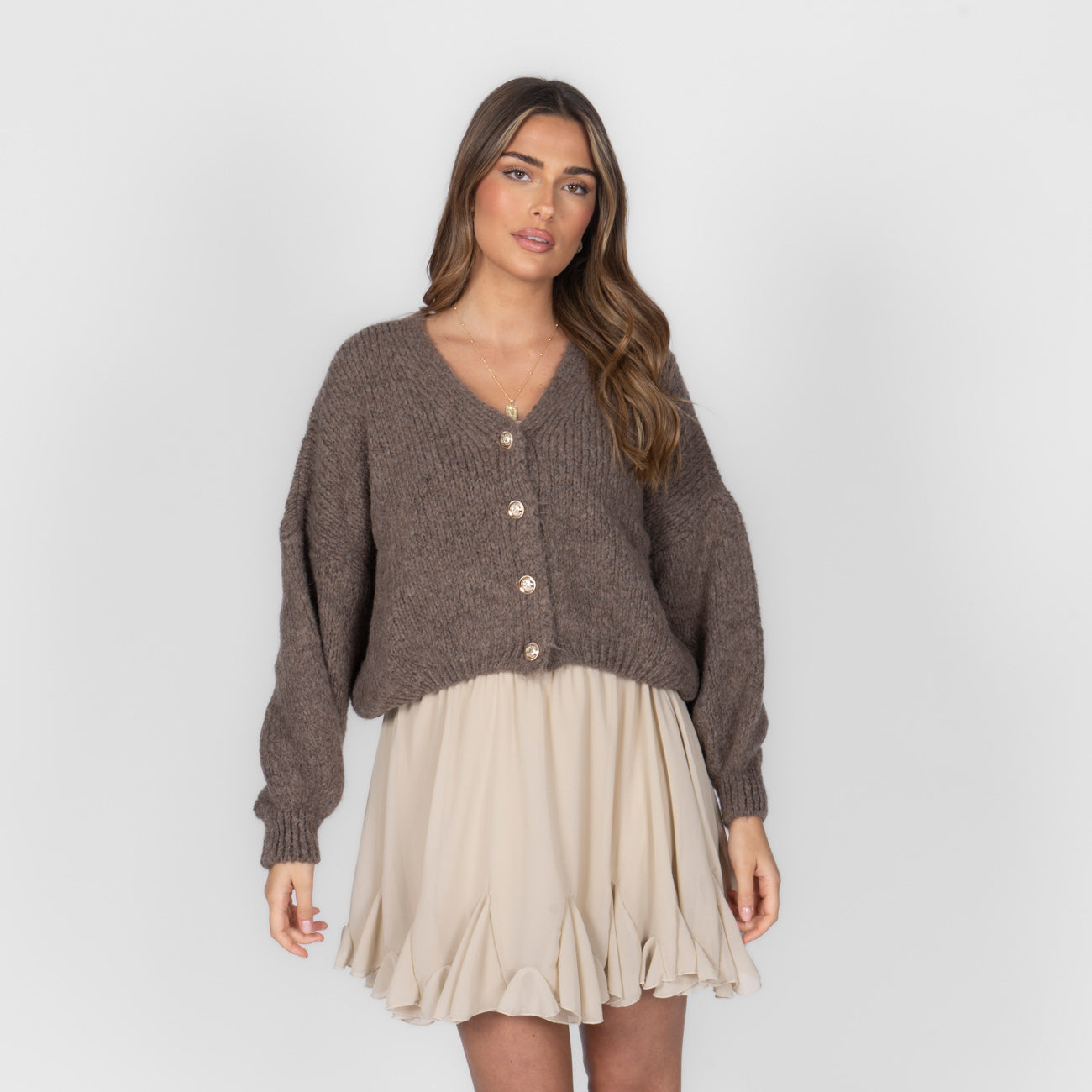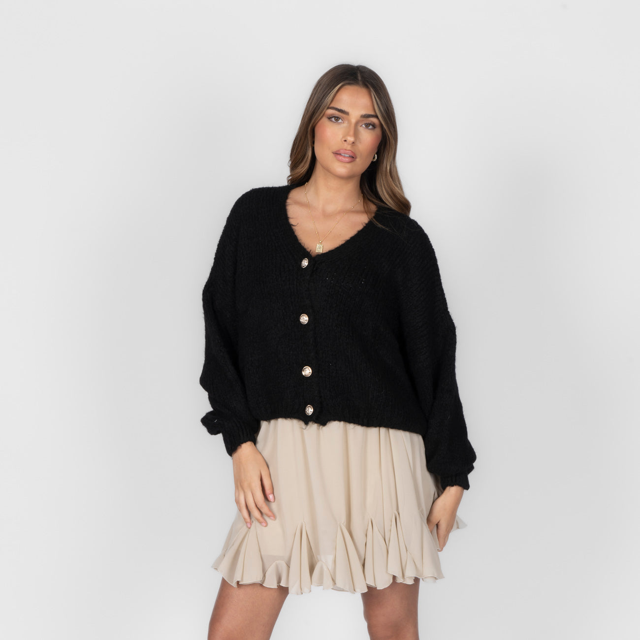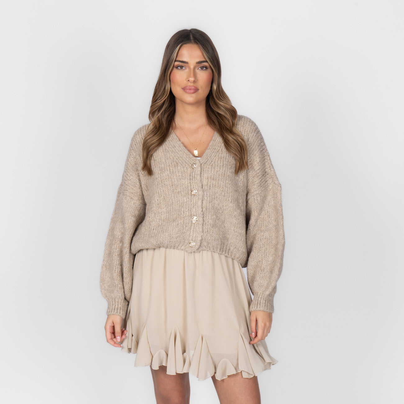 The CozyGlam V-Cardigan Short combines timeless elegance with maximum coziness. Its deep V-neck adds a feminine touch, while the soft knit quality guarantees a luxurious wearing experience. The oversize fit makes it particularly comfortable and versatile to combine – whether casual with jeans or chic over a dress.