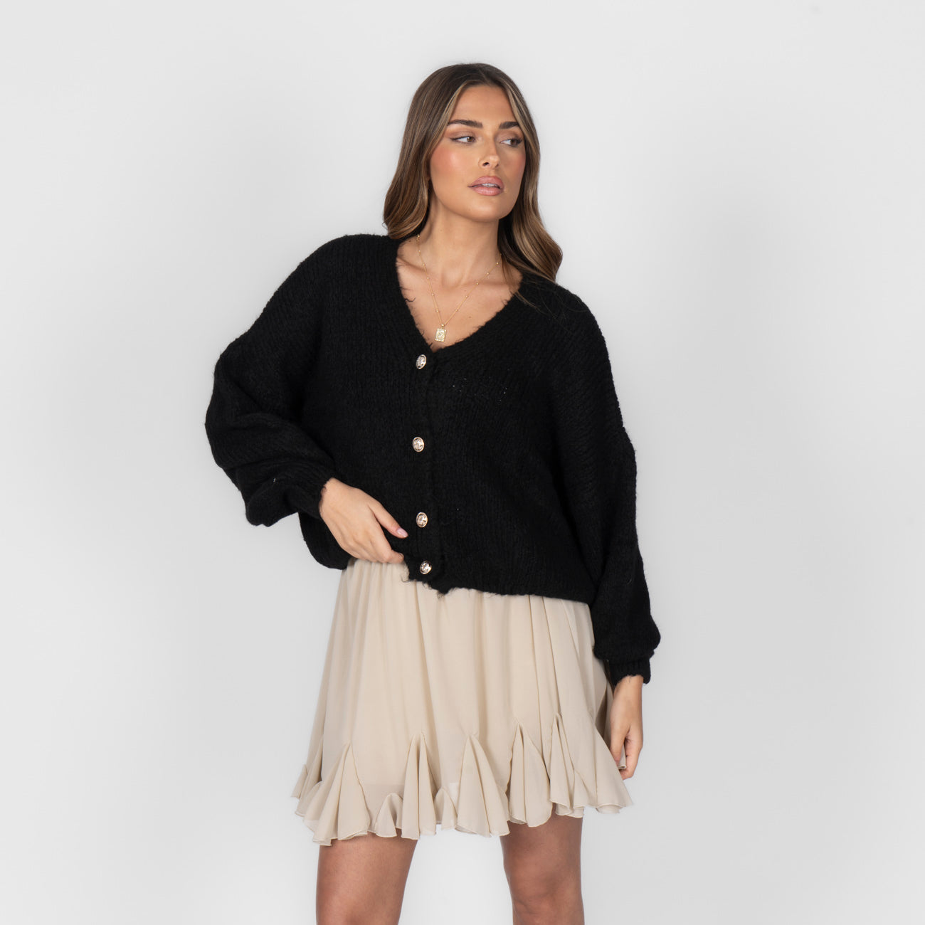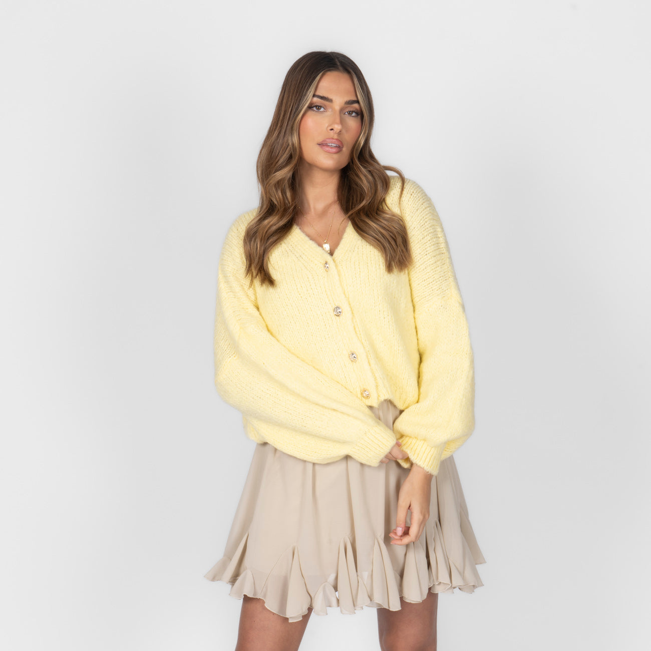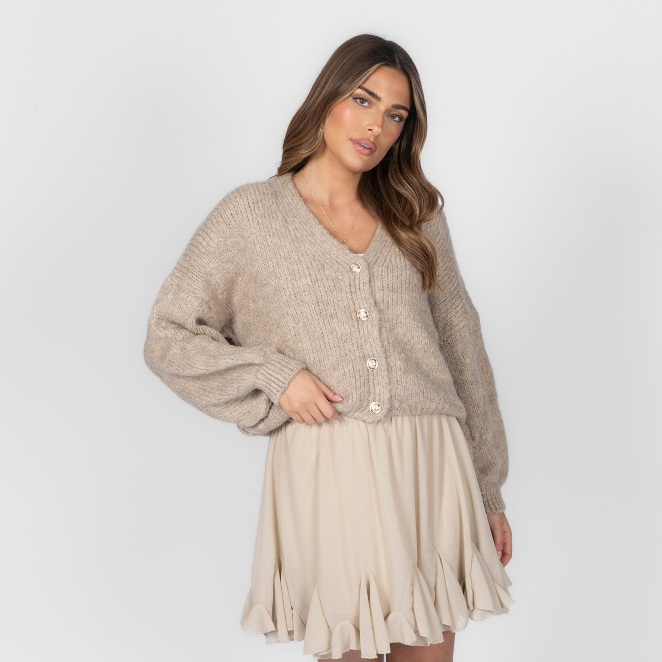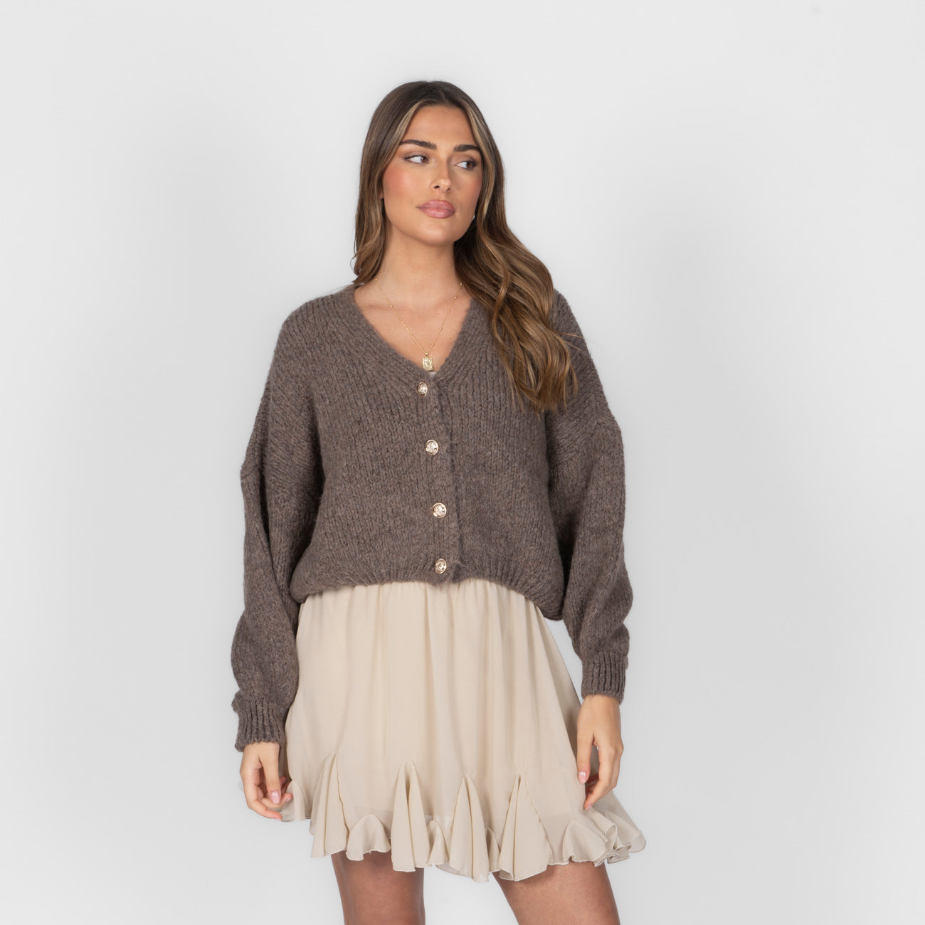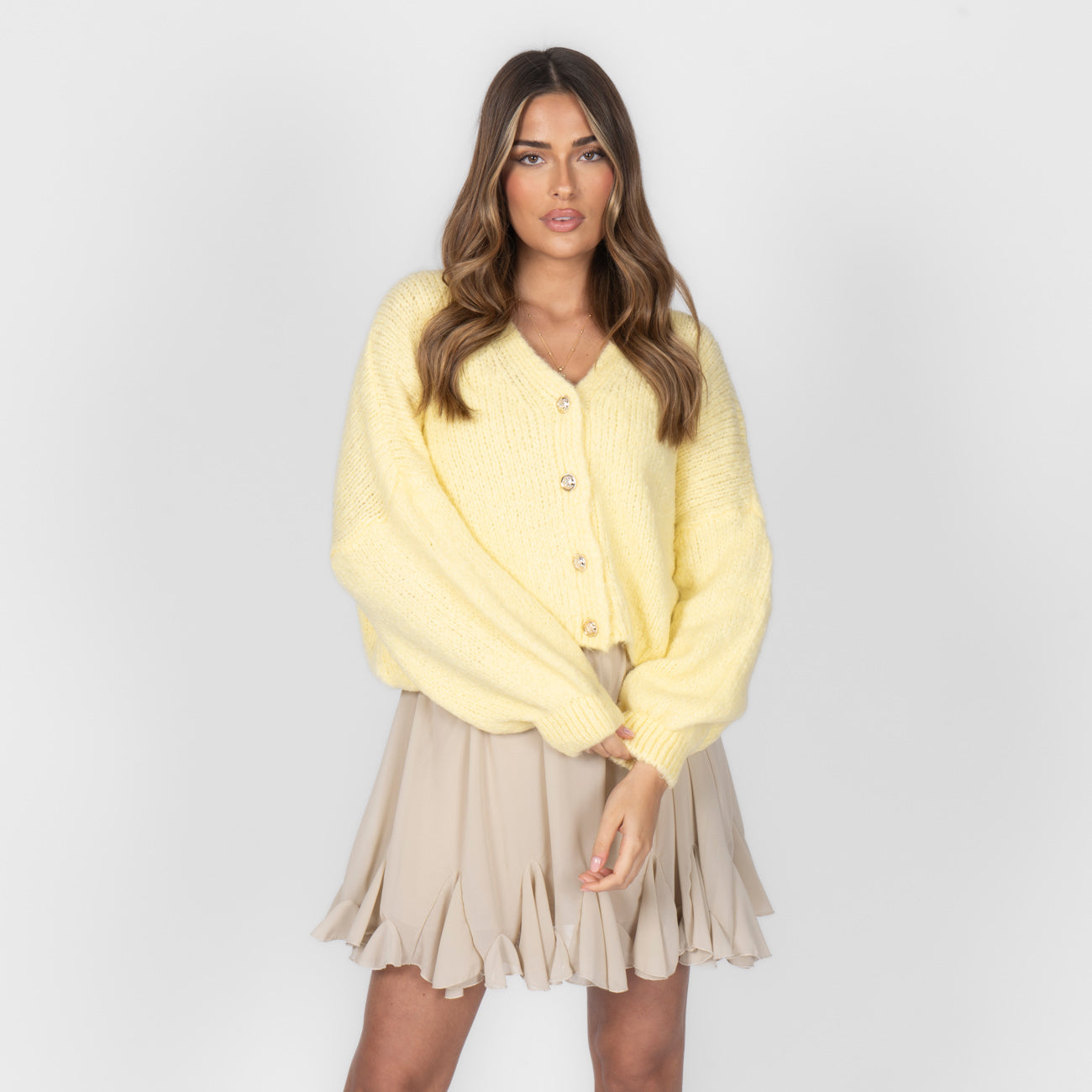 The CozyGlam V-Cardigan Short combines timeless elegance with maximum coziness. Its deep V-neck adds a feminine touch, while the soft knit quality guarantees a luxurious wearing experience. The oversize fit makes it particularly comfortable and versatile to combine – whether casual with jeans or chic over a dress.