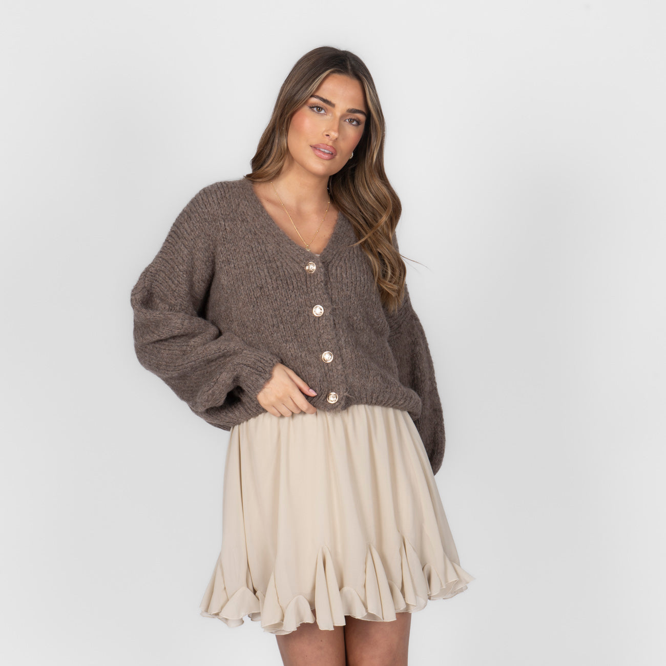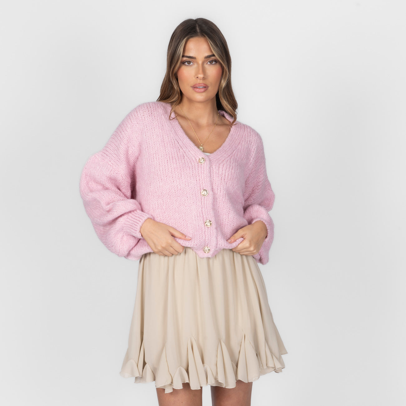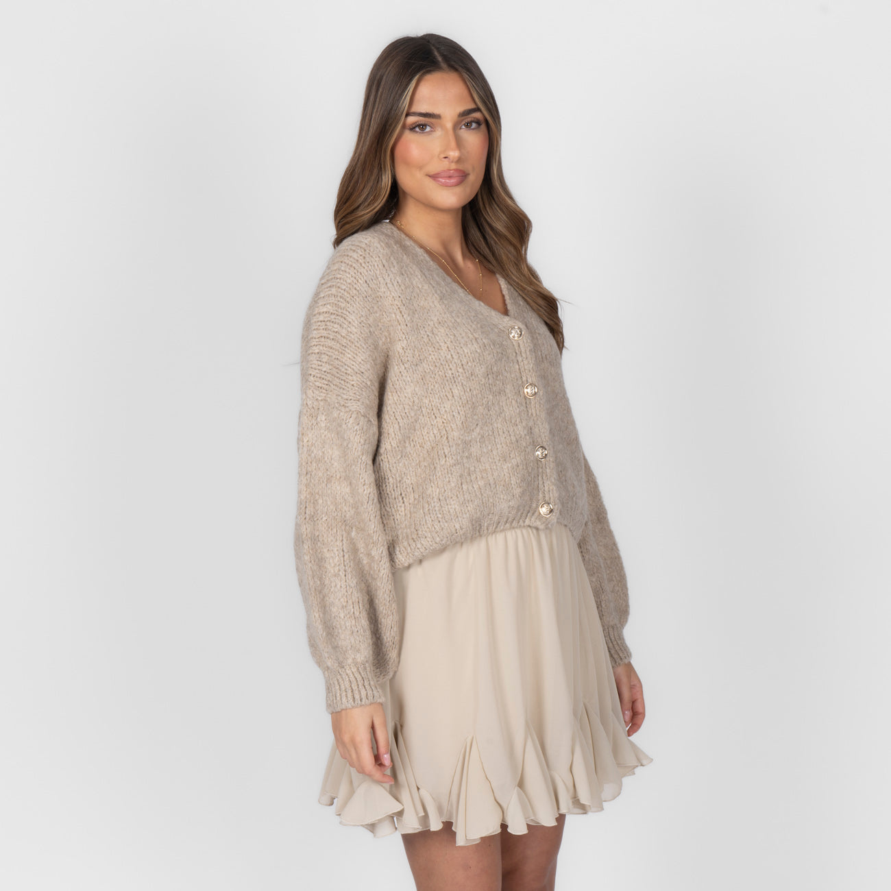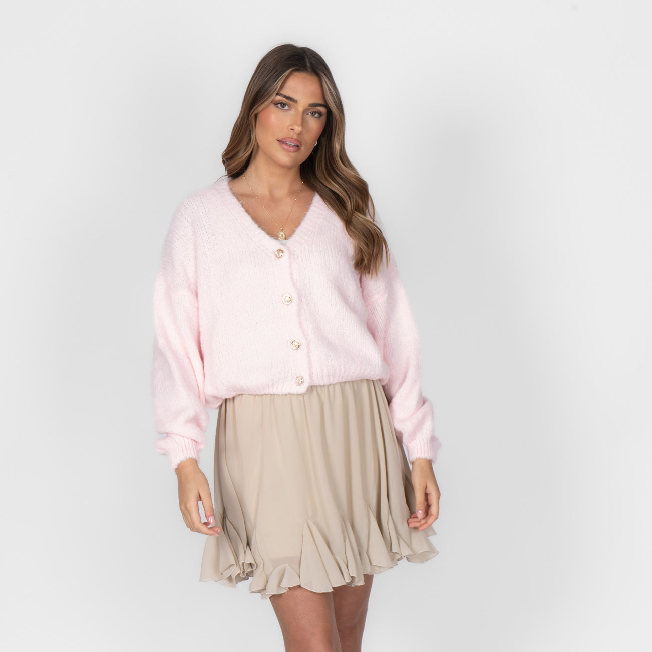 The CozyGlam V-Cardigan Short combines timeless elegance with maximum coziness. Its deep V-neck adds a feminine touch, while the soft knit quality guarantees a luxurious wearing experience. The oversize fit makes it particularly comfortable and versatile to combine – whether casual with jeans or chic over a dress.