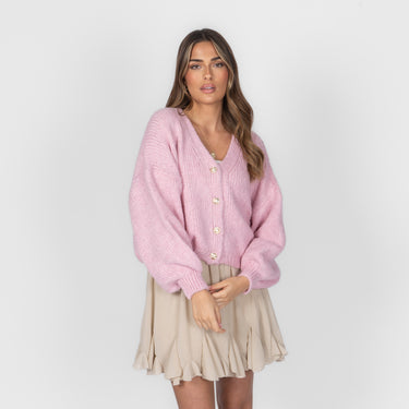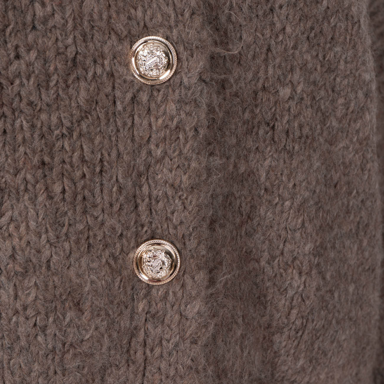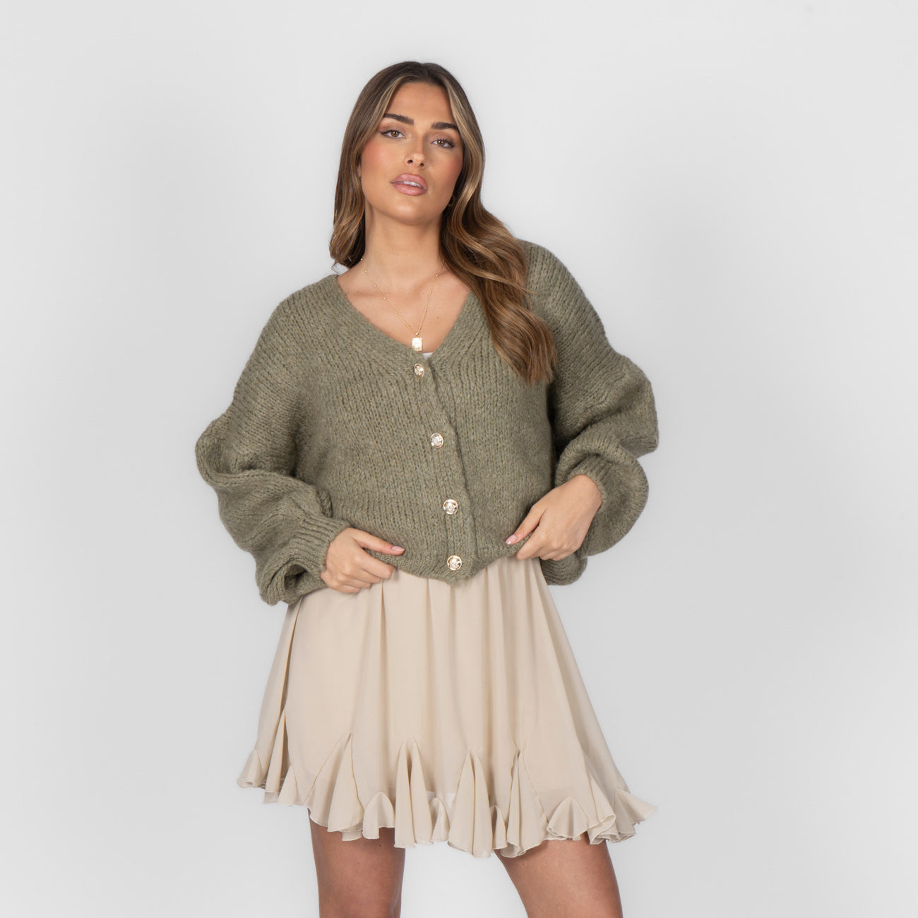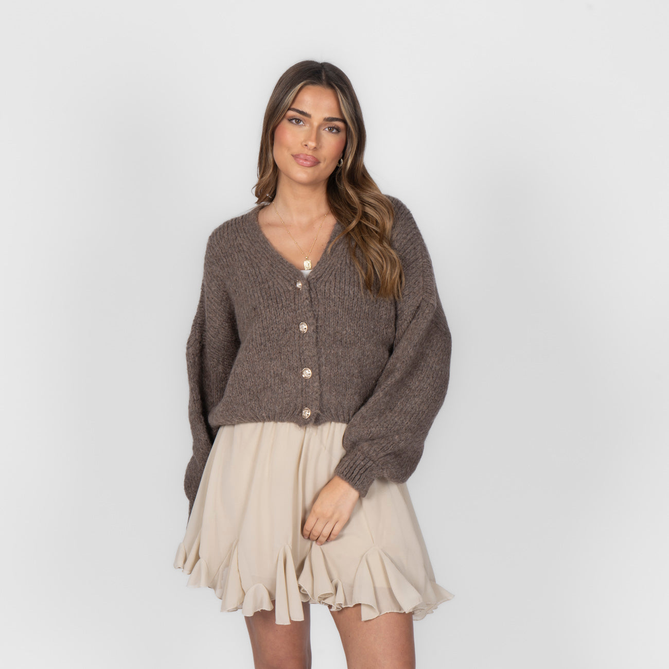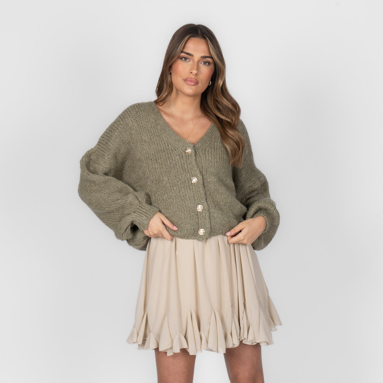 The CozyGlam V-Cardigan Short combines timeless elegance with maximum coziness. Its deep V-neck adds a feminine touch, while the soft knit quality guarantees a luxurious wearing experience. The oversize fit makes it particularly comfortable and versatile to combine – whether casual with jeans or chic over a dress.