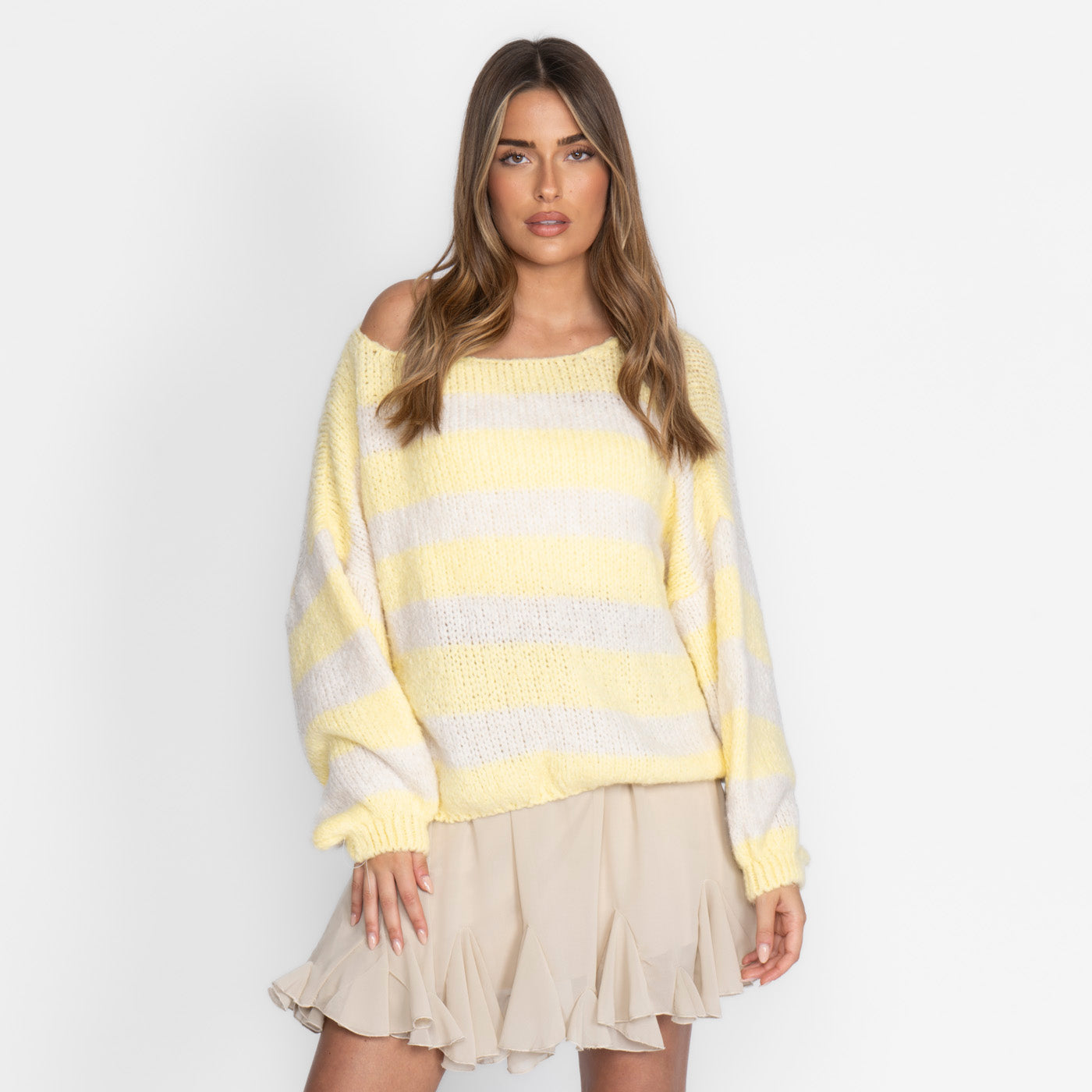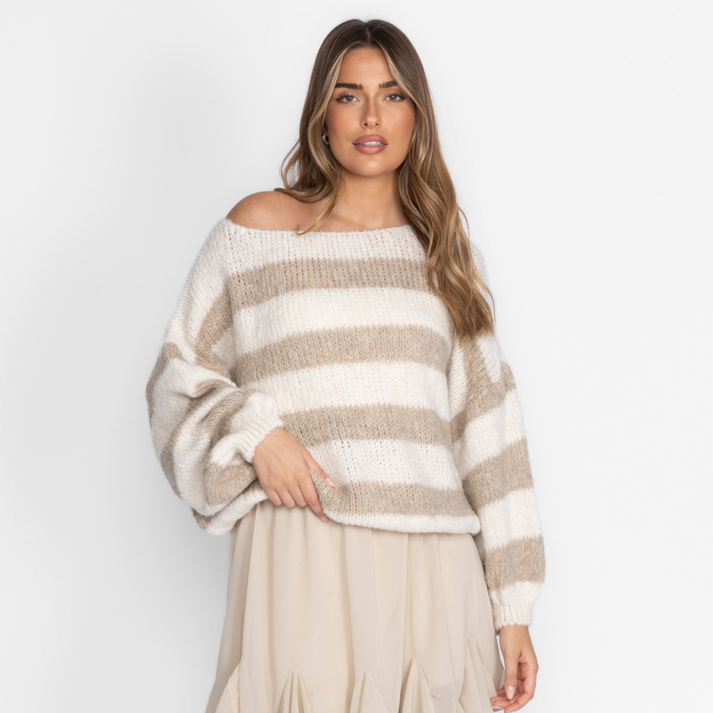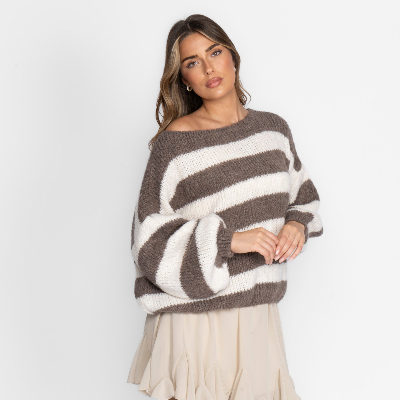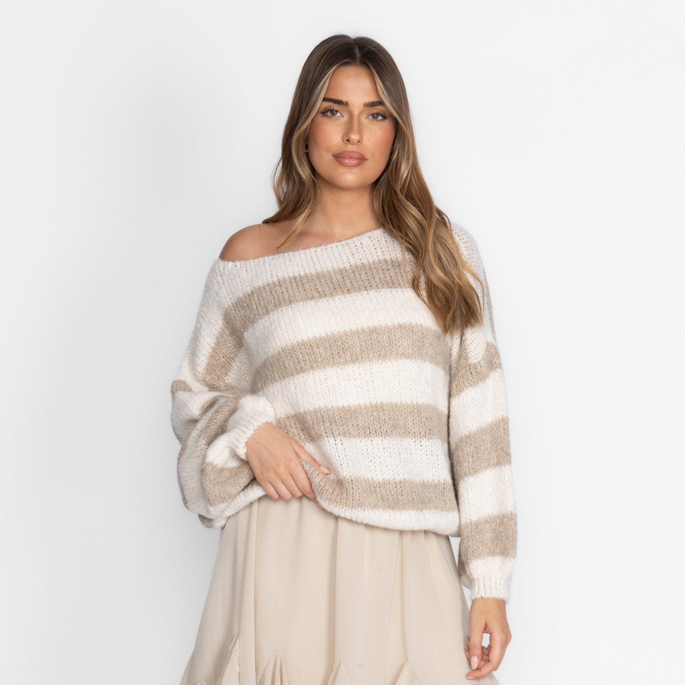 Feels like a gentle hug – and looks just as good. Our cozy off-shoulder sweater drapes over your shoulders with ease and gives you that effortlessly feminine look. The oversized sleeves add volume and style, while the ultra-soft knit material lets you relax instantly.