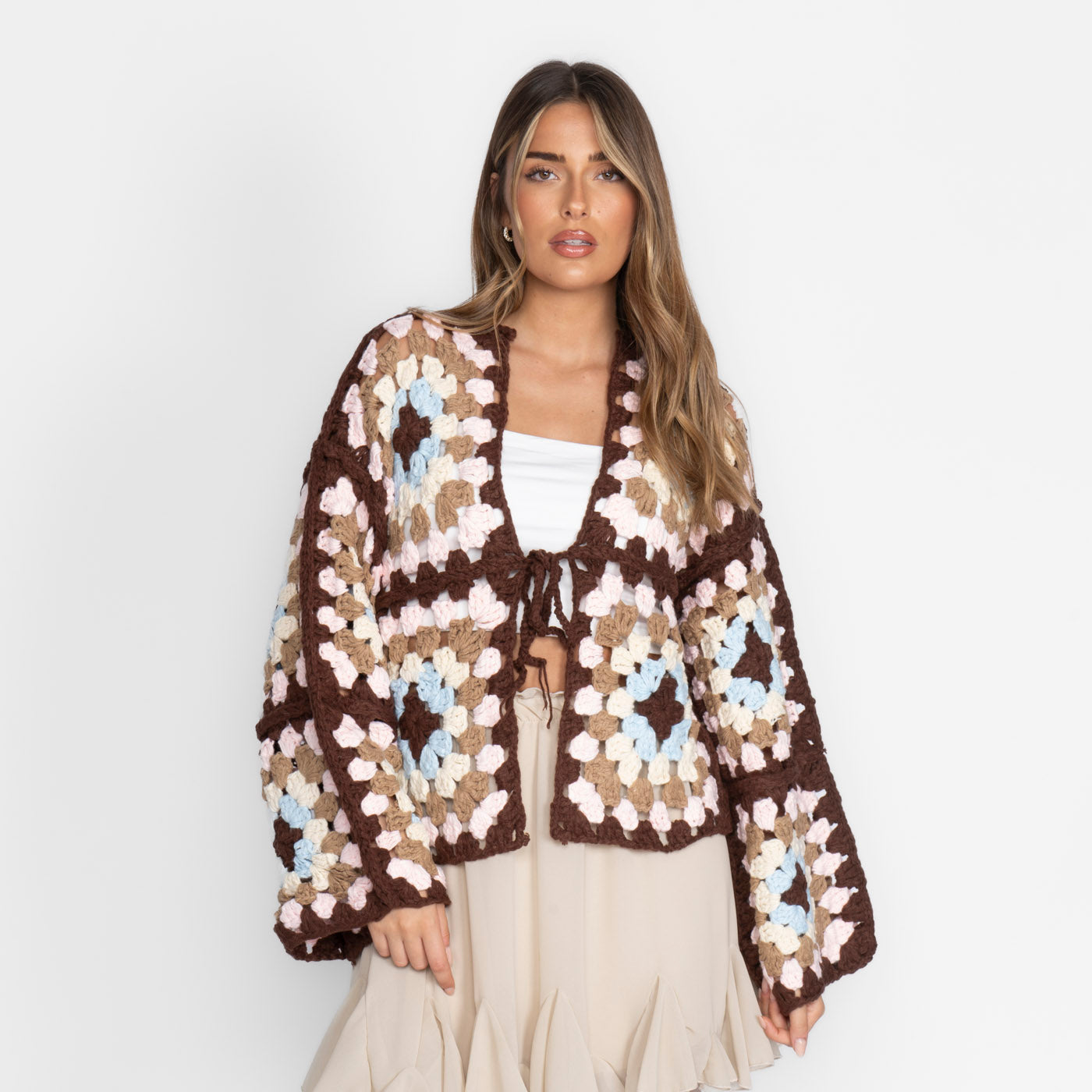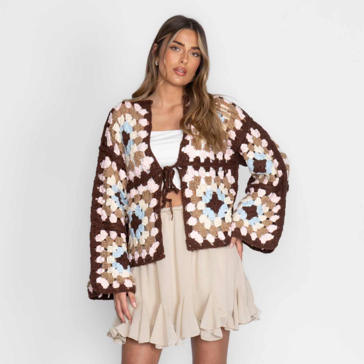 Jedes Detail ein Statement: Der Handmade Bloom Cardigan vereint nostalgischen Handmade-Charme mit moderner Leichtigkeit. Die liebevoll gehäkelten Granny-Squares in frischen Pink-, Lila- und Creme-Tönen machen ihn zum Eyecatcher für alle, die es individuell, verspielt und cozy lieben. Die lockere Passform, die weit geschnittenen Ärmel und die zarte Bindung vorn geben deinem Outfit einen unverwechselbaren Boho-Vibe – perfekt für Frühling, Sommer und laue Abende.