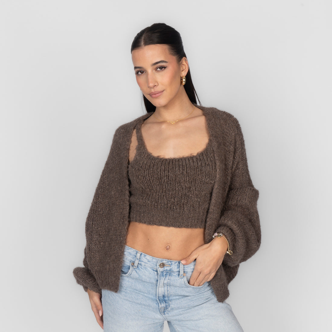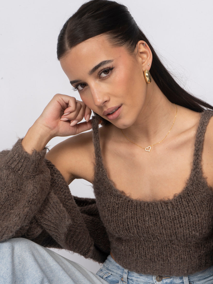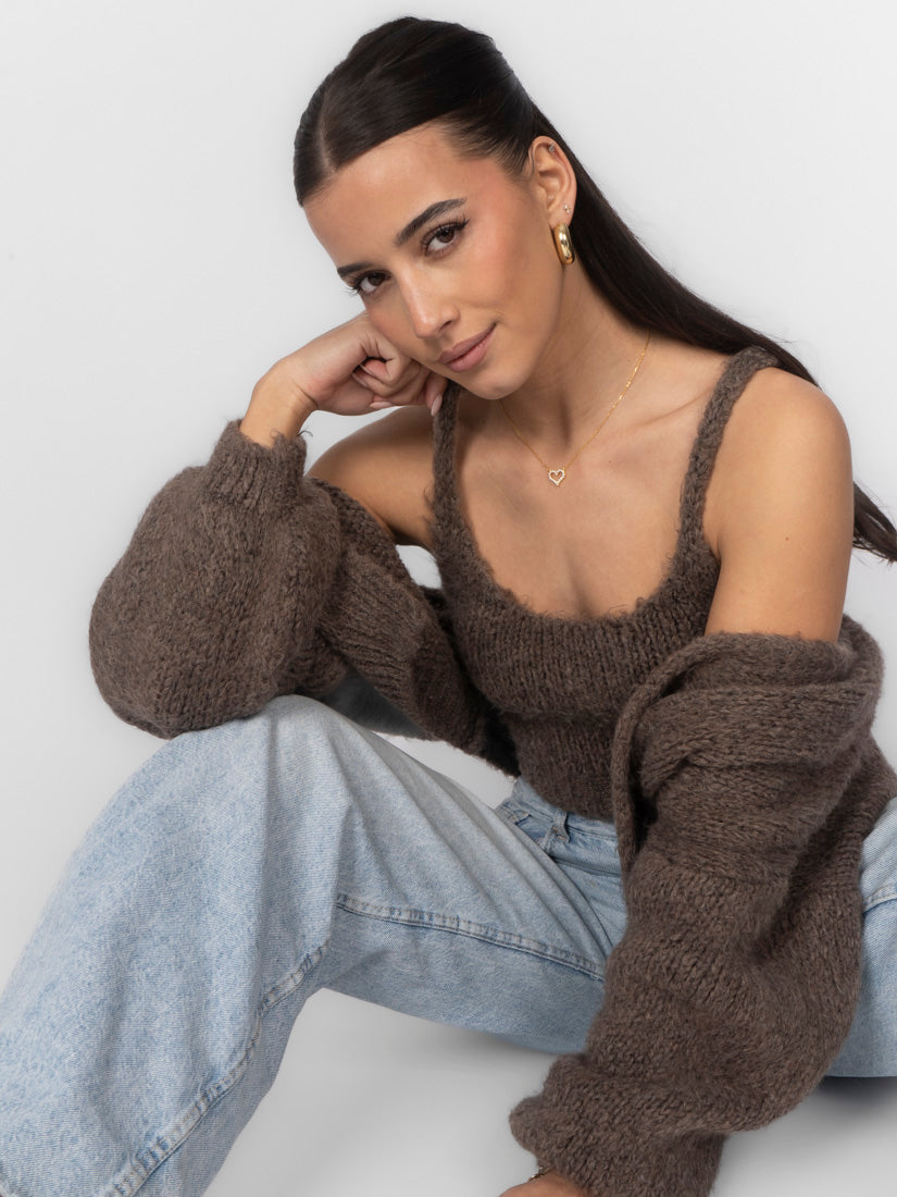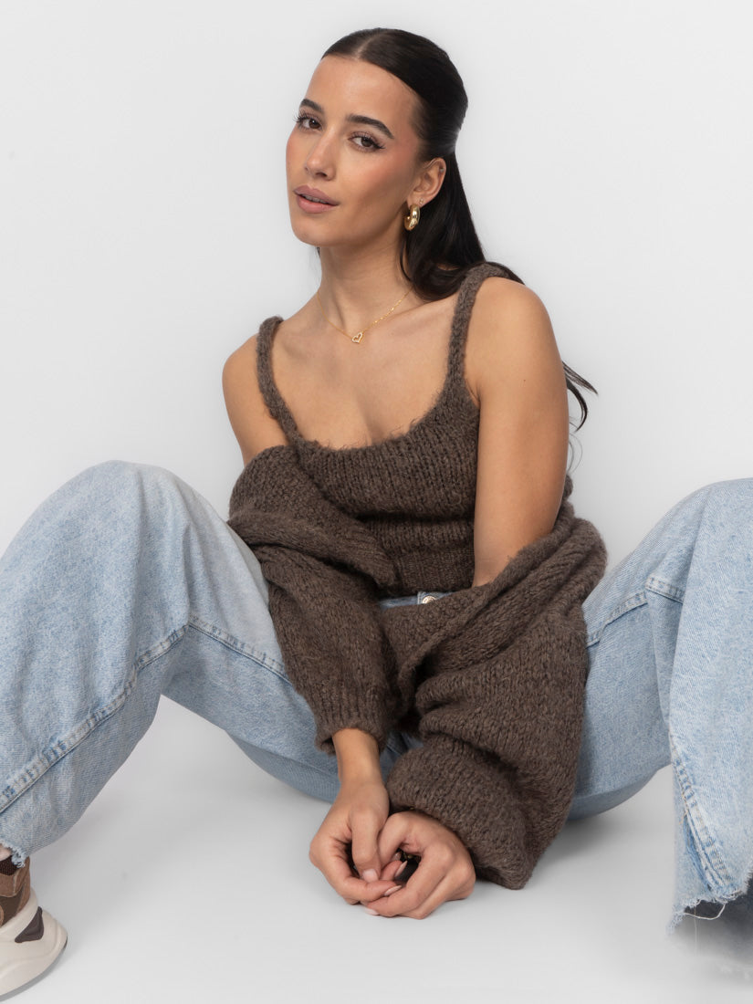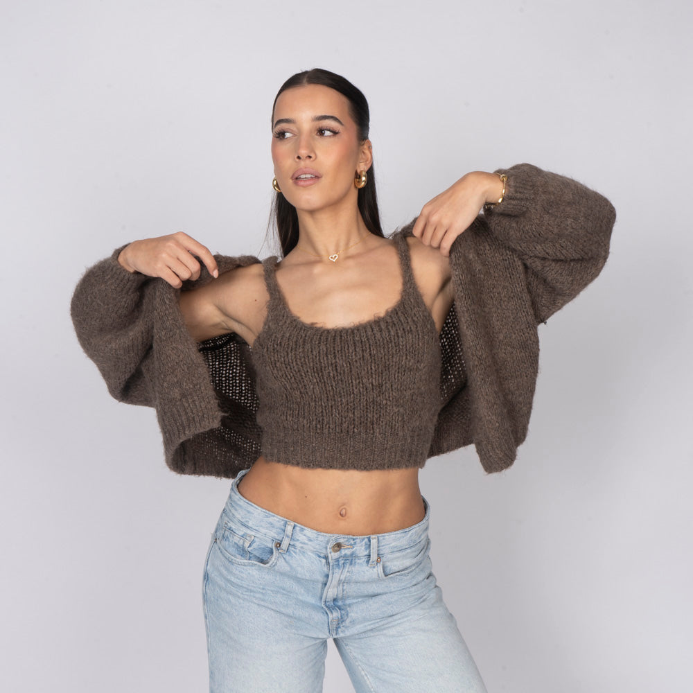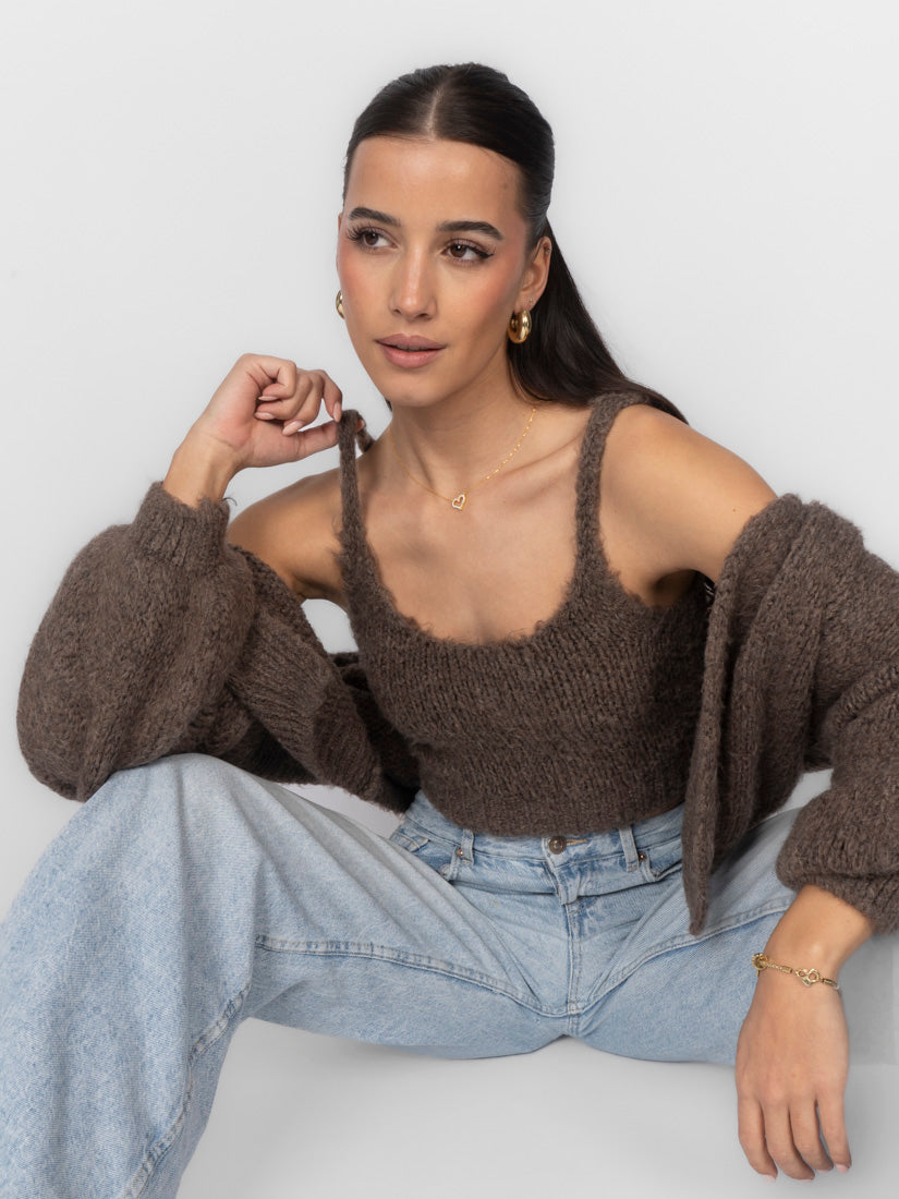 Unser Cozy Strick-Zweiteiler ist die perfekte Kombination aus Komfort und Stil. Das Set besteht aus einem weichen, figurbetonten Cropped-Top mit zarten Trägern und einem passenden Cardigan, der locker darüber fällt und den Look harmonisch abrundet.