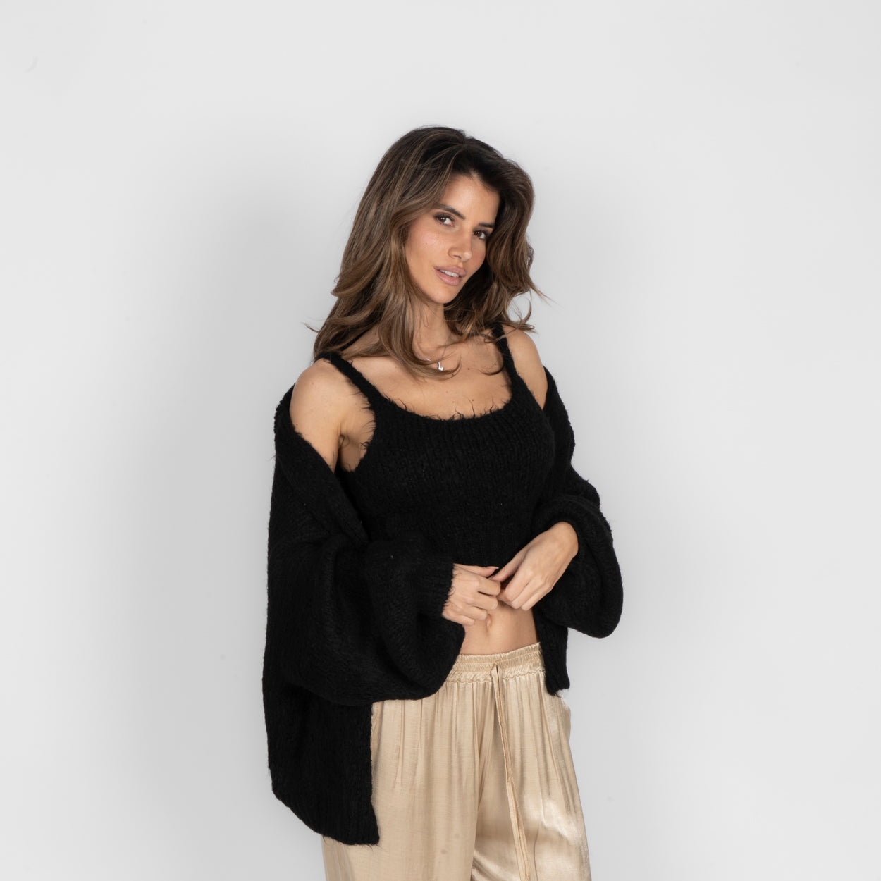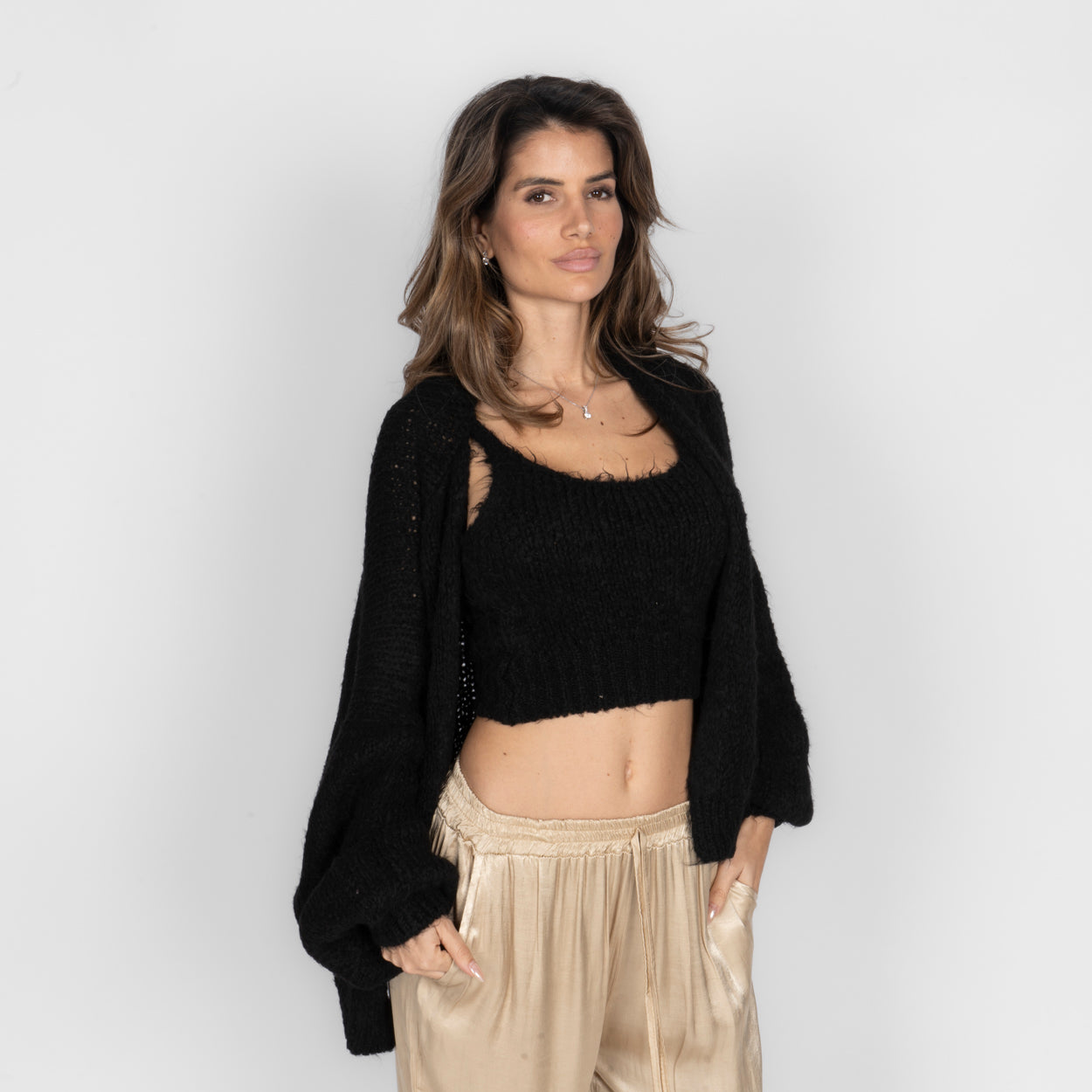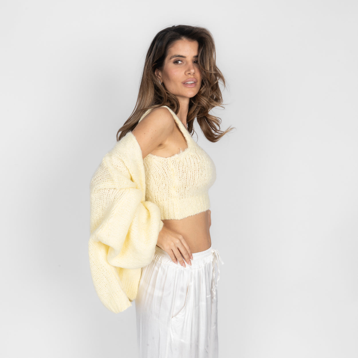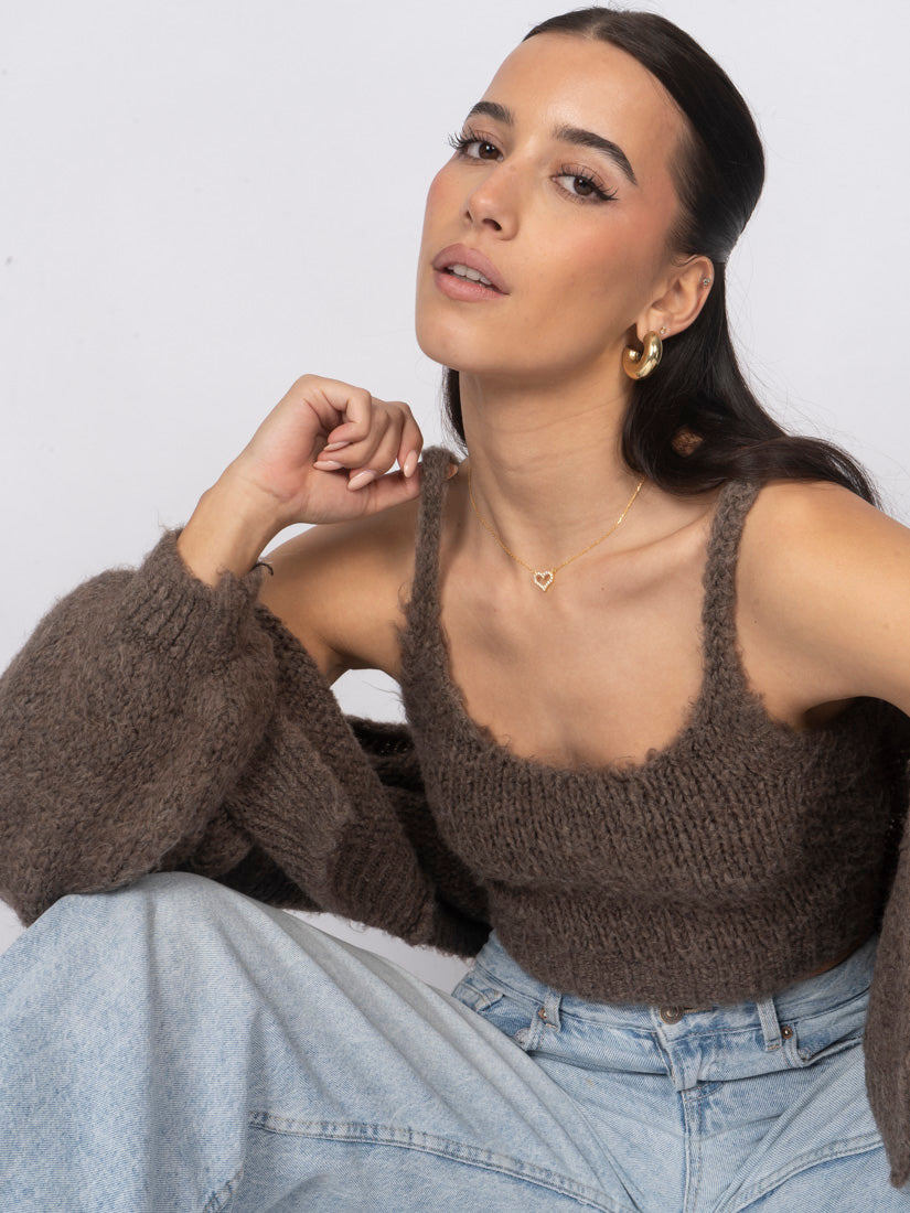 Unser Cozy Strick-Zweiteiler ist die perfekte Kombination aus Komfort und Stil. Das Set besteht aus einem weichen, figurbetonten Cropped-Top mit zarten Trägern und einem passenden Cardigan, der locker darüber fällt und den Look harmonisch abrundet.