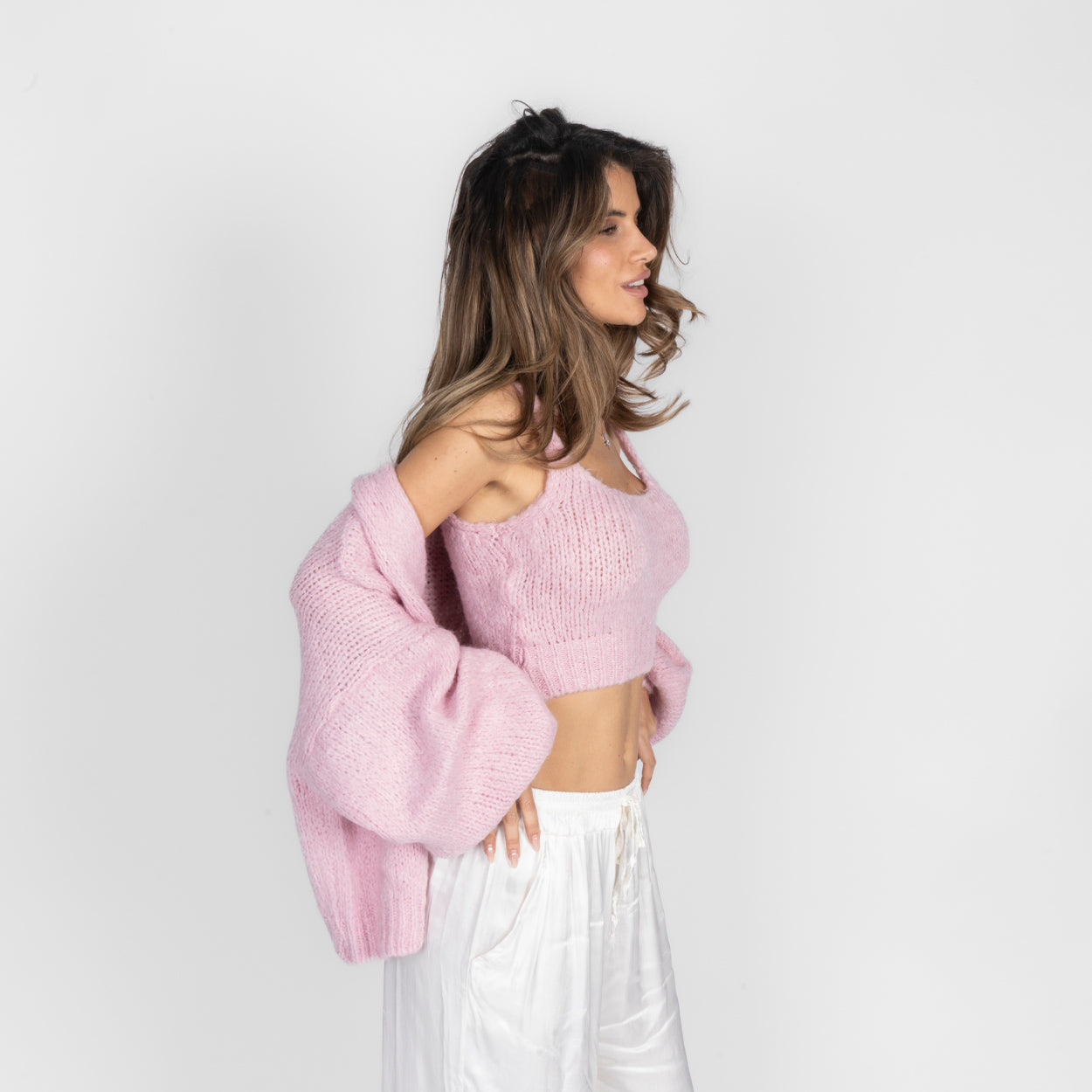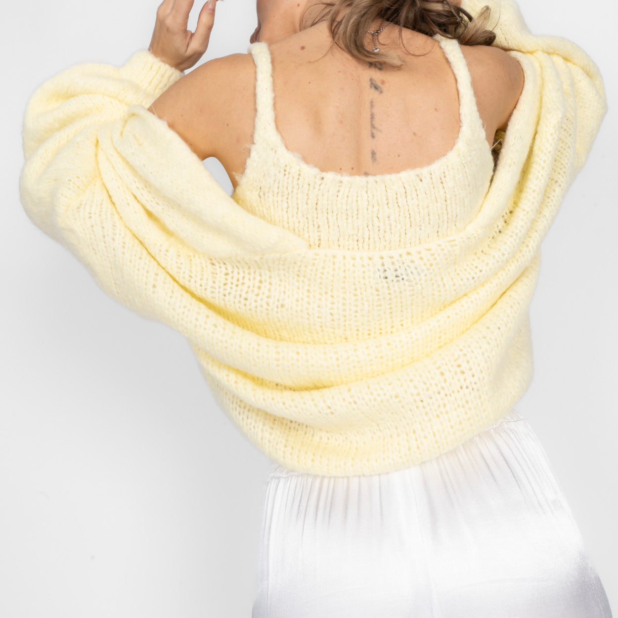 Das hochwertige, flauschige Strickmaterial fühlt sich angenehm soft auf der Haut an und sorgt für ein gemütliches Tragegefühl – ganz ohne Kratzen. Ob zusammen als Set getragen oder einzeln kombiniert: Dieses Duo ist vielseitig einsetzbar und verleiht jedem Outfit eine feminine, moderne Note.