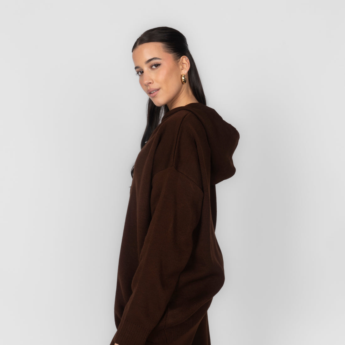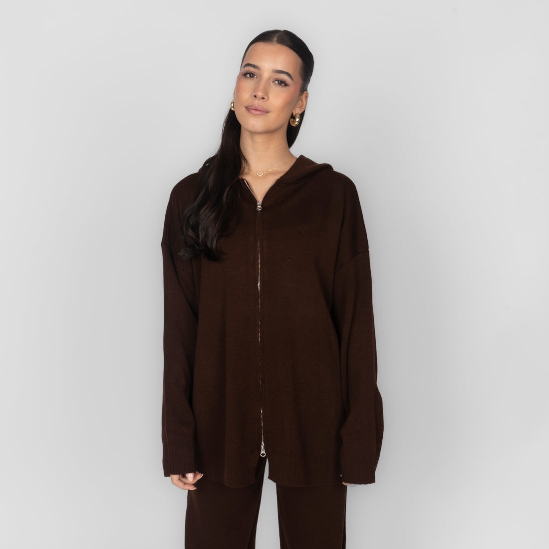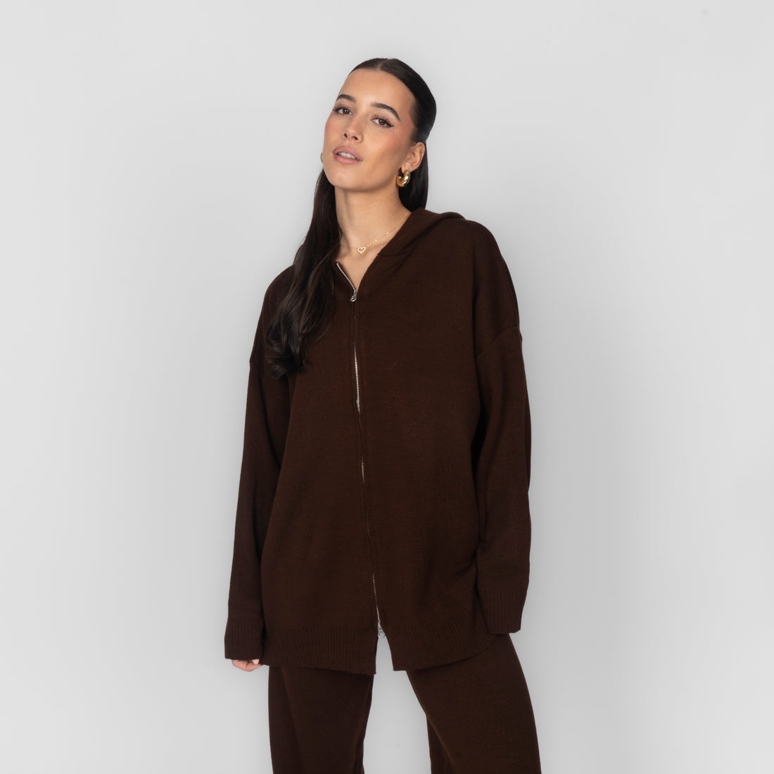 Das Set besteht aus einer locker geschnittenen Strickjacke mit durchgehendem Reißverschluss und Kapuze sowie einer passenden Hose mit elastischem Bund. Der weiche, angenehm fallende Strick sorgt für ein besonders gemütliches Tragegefühl, während die entspannte Silhouette einen mühelos stilvollen Look schafft.