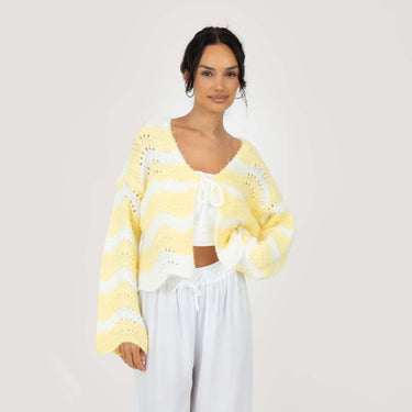 Ein Hauch von Leichtigkeit – der Soft Wave Cardigan ist wie gemacht für sanfte Sommertage. Zarte Wellenstrukturen, ein feminines Schleifendetail und die luftige, kurze Passform verleihen ihm einen verspielten und zugleich edlen Look. Die weiche Strickqualität schmiegt sich angenehm an und macht ihn zum perfekten Layering-Piece für warme Nachmittage und laue Abende.