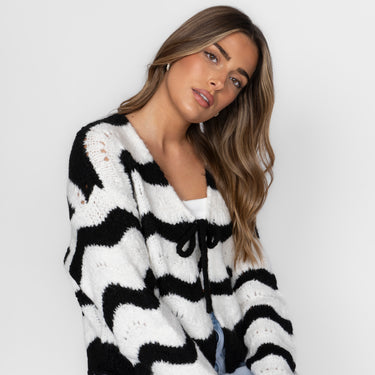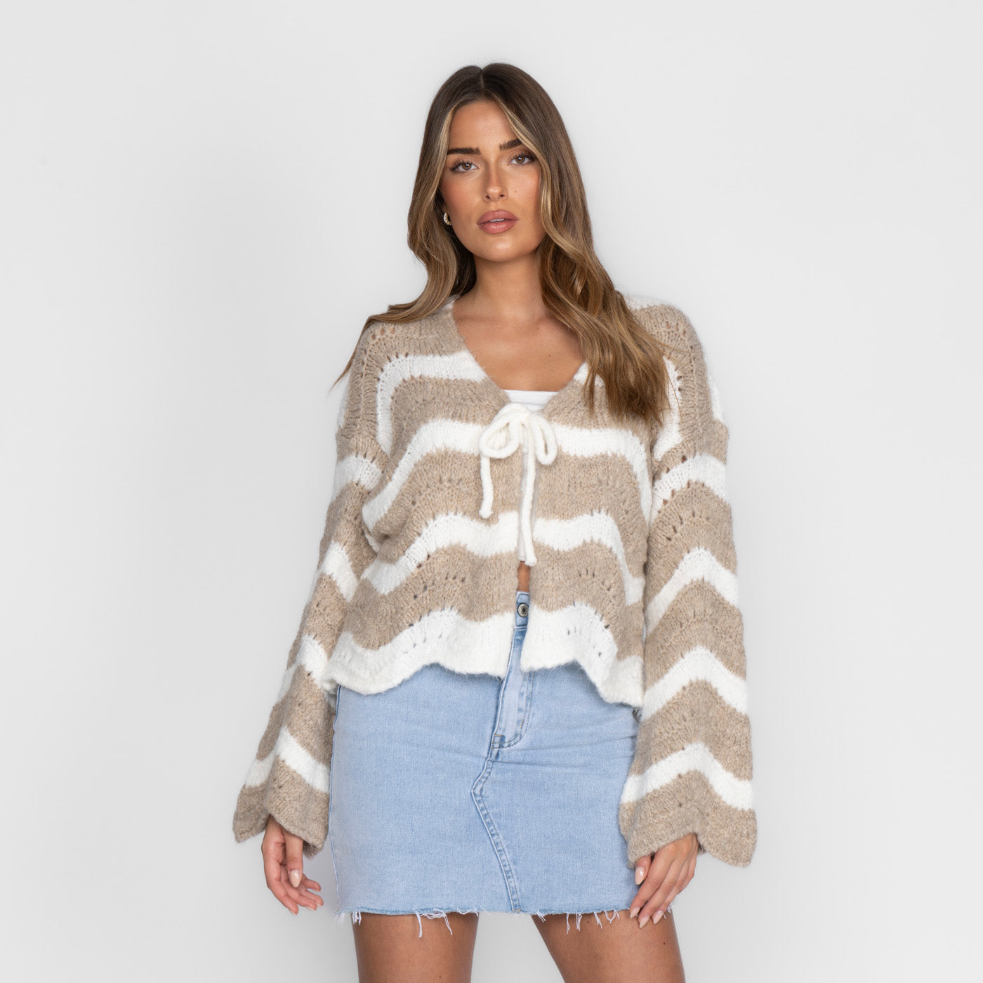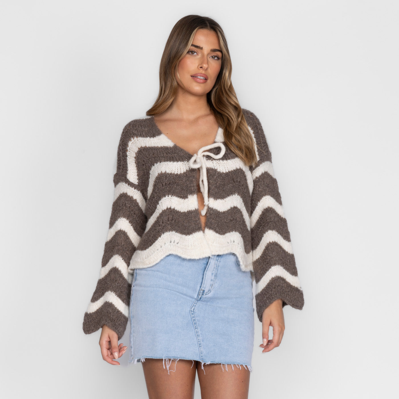 Ein Hauch von Leichtigkeit – der Soft Wave Cardigan ist wie gemacht für sanfte Sommertage. Zarte Wellenstrukturen, ein feminines Schleifendetail und die luftige, kurze Passform verleihen ihm einen verspielten und zugleich edlen Look. Die weiche Strickqualität schmiegt sich angenehm an und macht ihn zum perfekten Layering-Piece für warme Nachmittage und laue Abende.