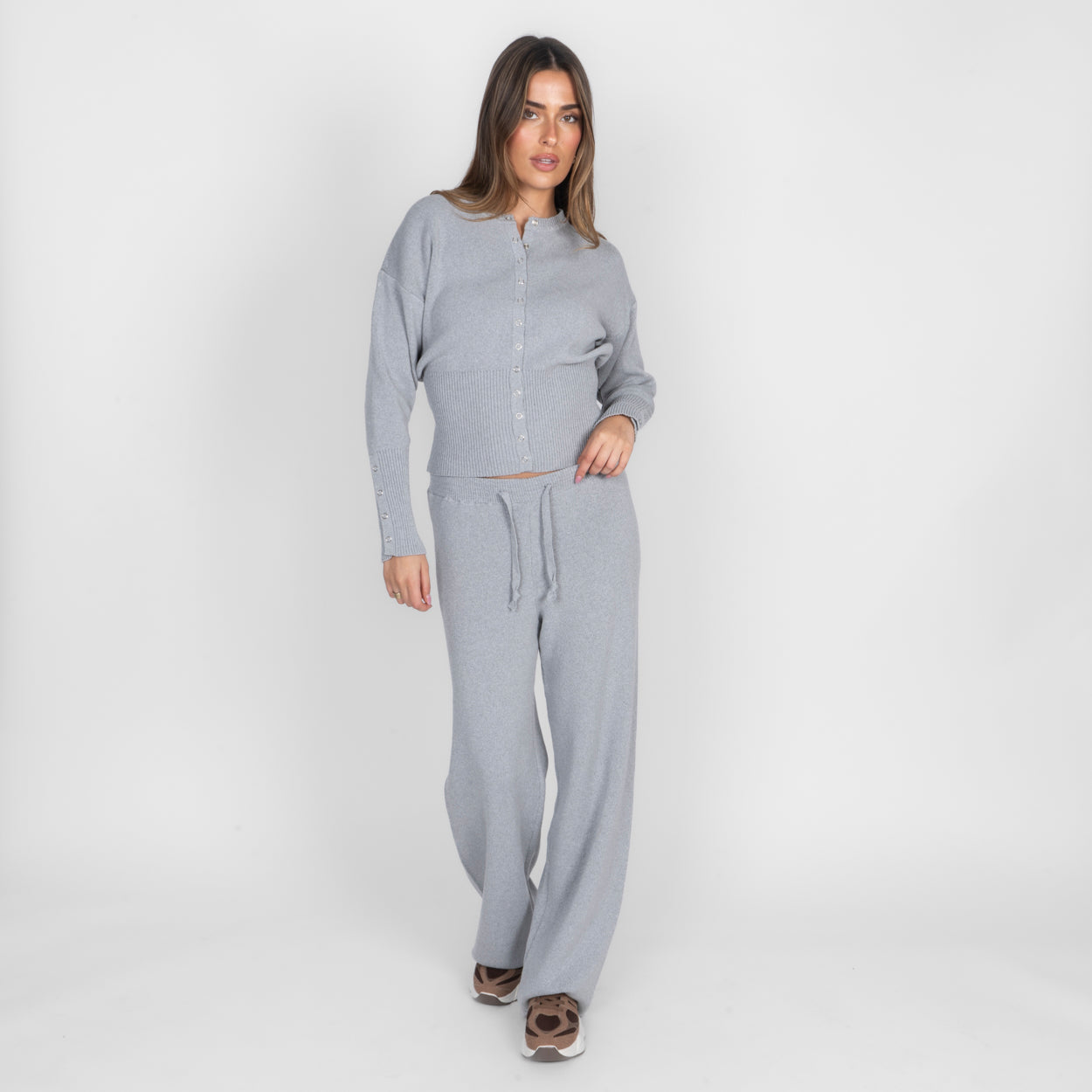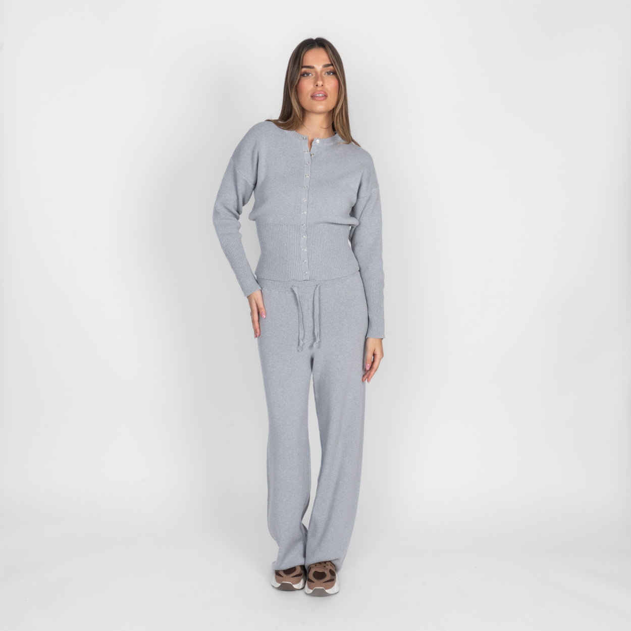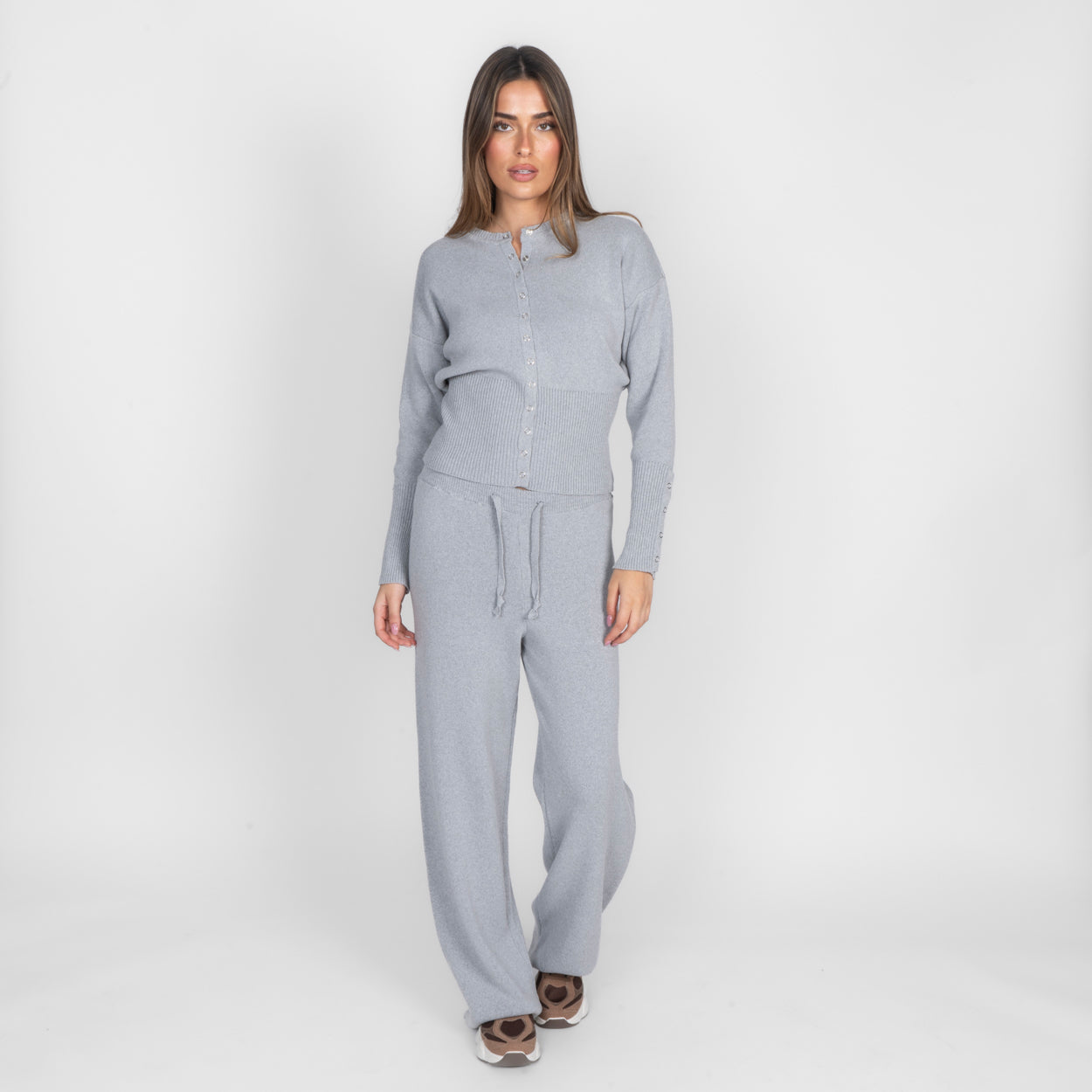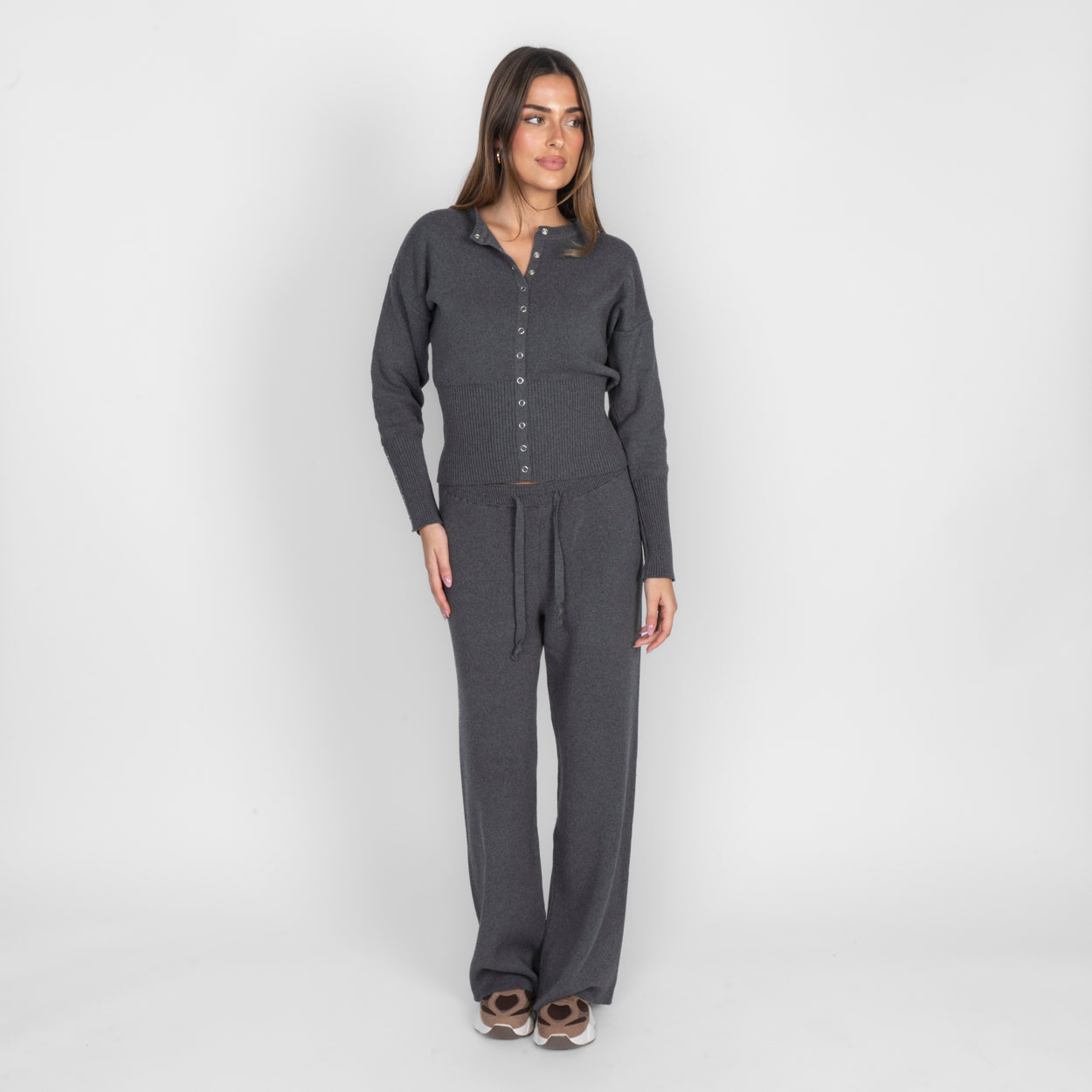 Unser Daily Button Zweiteiler verbindet Komfort mit einem modernen, lässigen Look. Das Set besteht aus einer Strickjacke mit Reißverschluss und einer passenden Hose, die durch ihren lockeren Schnitt besonders bequem sitzt. Der weiche Strick fühlt sich angenehm auf der Haut an und macht das Set zum perfekten Begleiter für entspannte Tage.