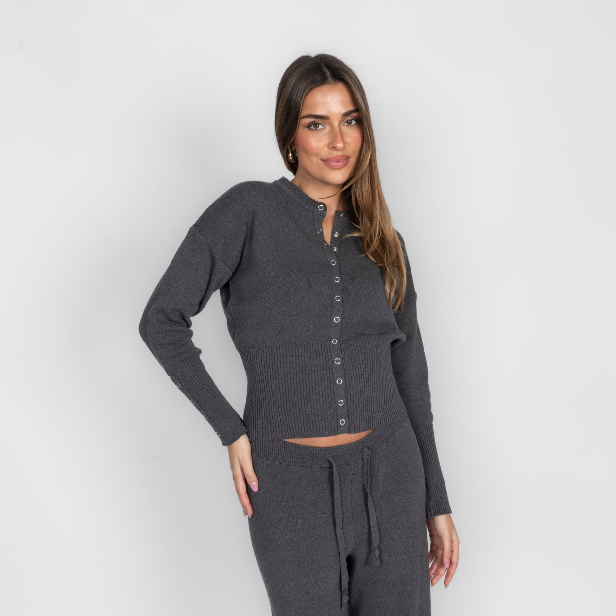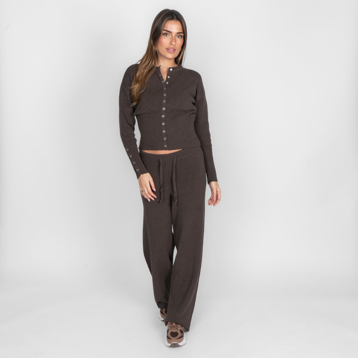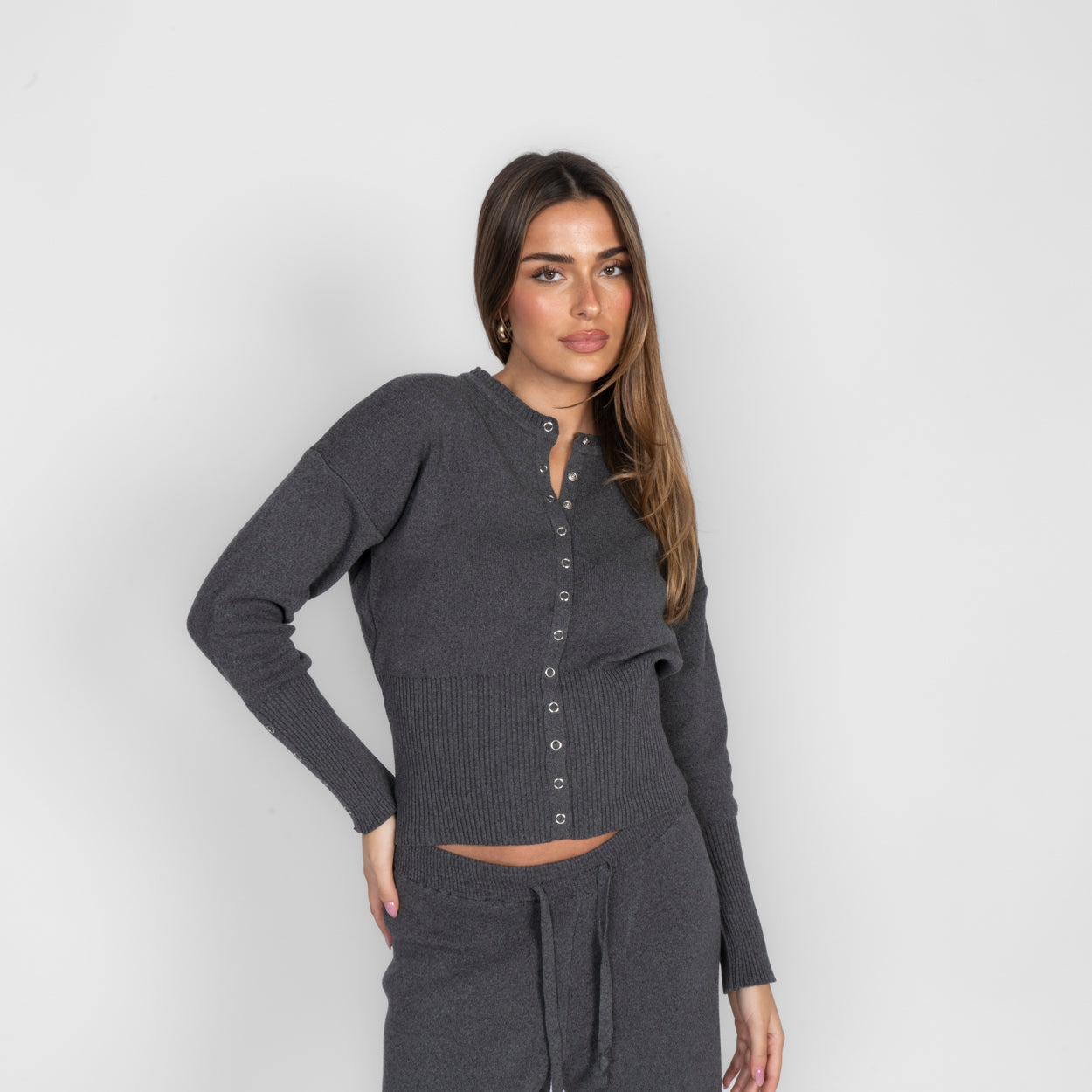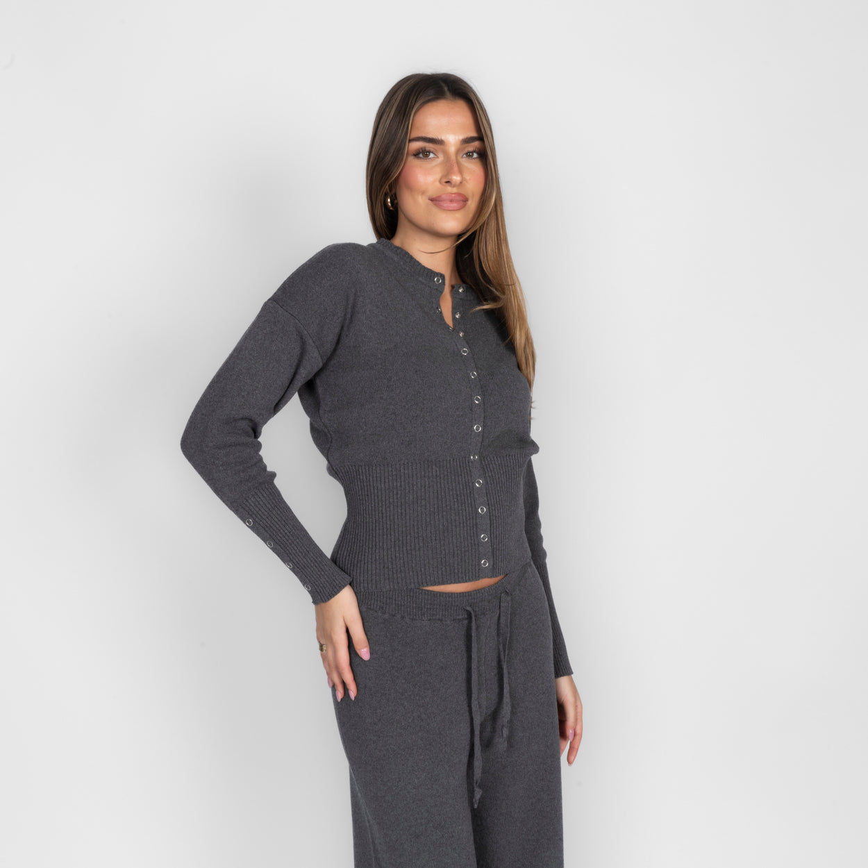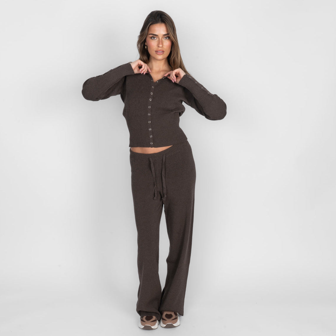 Unser Daily Button Zweiteiler verbindet Komfort mit einem modernen, lässigen Look. Das Set besteht aus einer Strickjacke mit Reißverschluss und einer passenden Hose, die durch ihren lockeren Schnitt besonders bequem sitzt. Der weiche Strick fühlt sich angenehm auf der Haut an und macht das Set zum perfekten Begleiter für entspannte Tage.