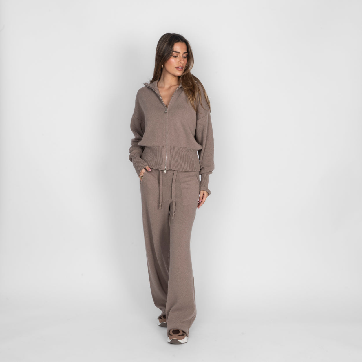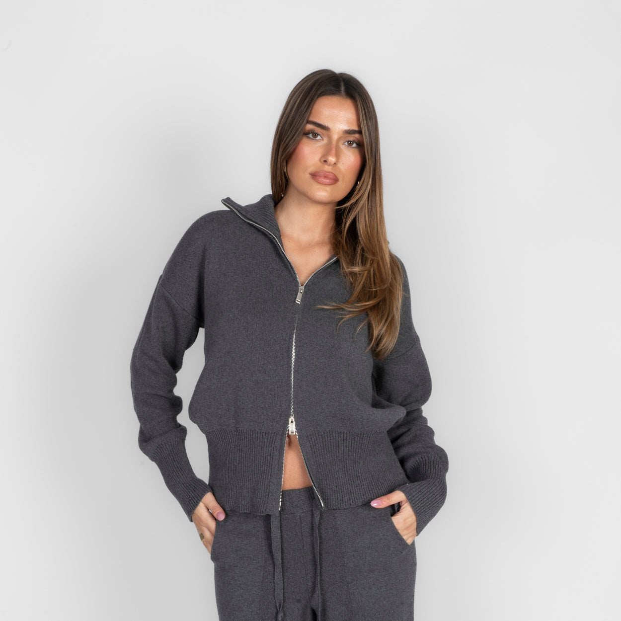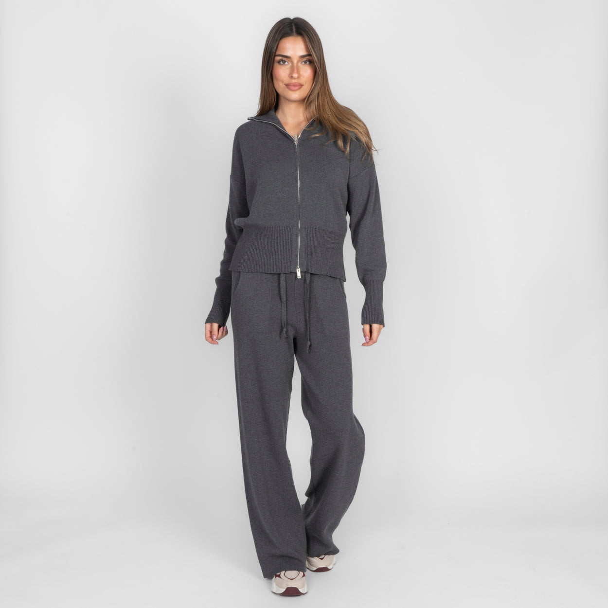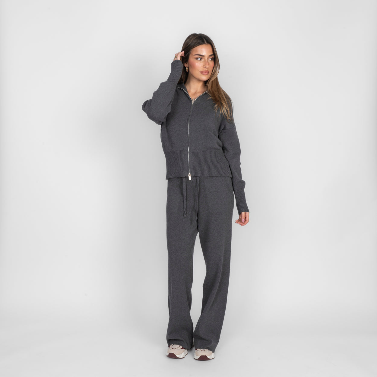 Unser Everyday Lounge Zweiteiler verbindet Komfort mit einem modernen, lässigen Look. Das Set besteht aus einer Strickjacke mit Reißverschluss und einer passenden Hose, die durch ihren lockeren Schnitt besonders bequem sitzt. Der weiche Strick fühlt sich angenehm auf der Haut an und macht das Set zum perfekten Begleiter für entspannte Tage.