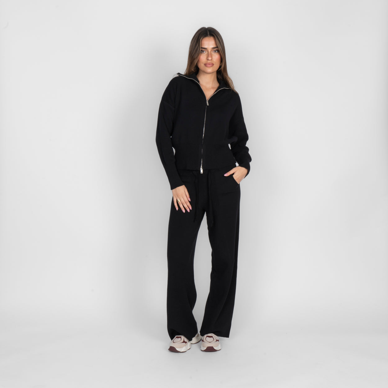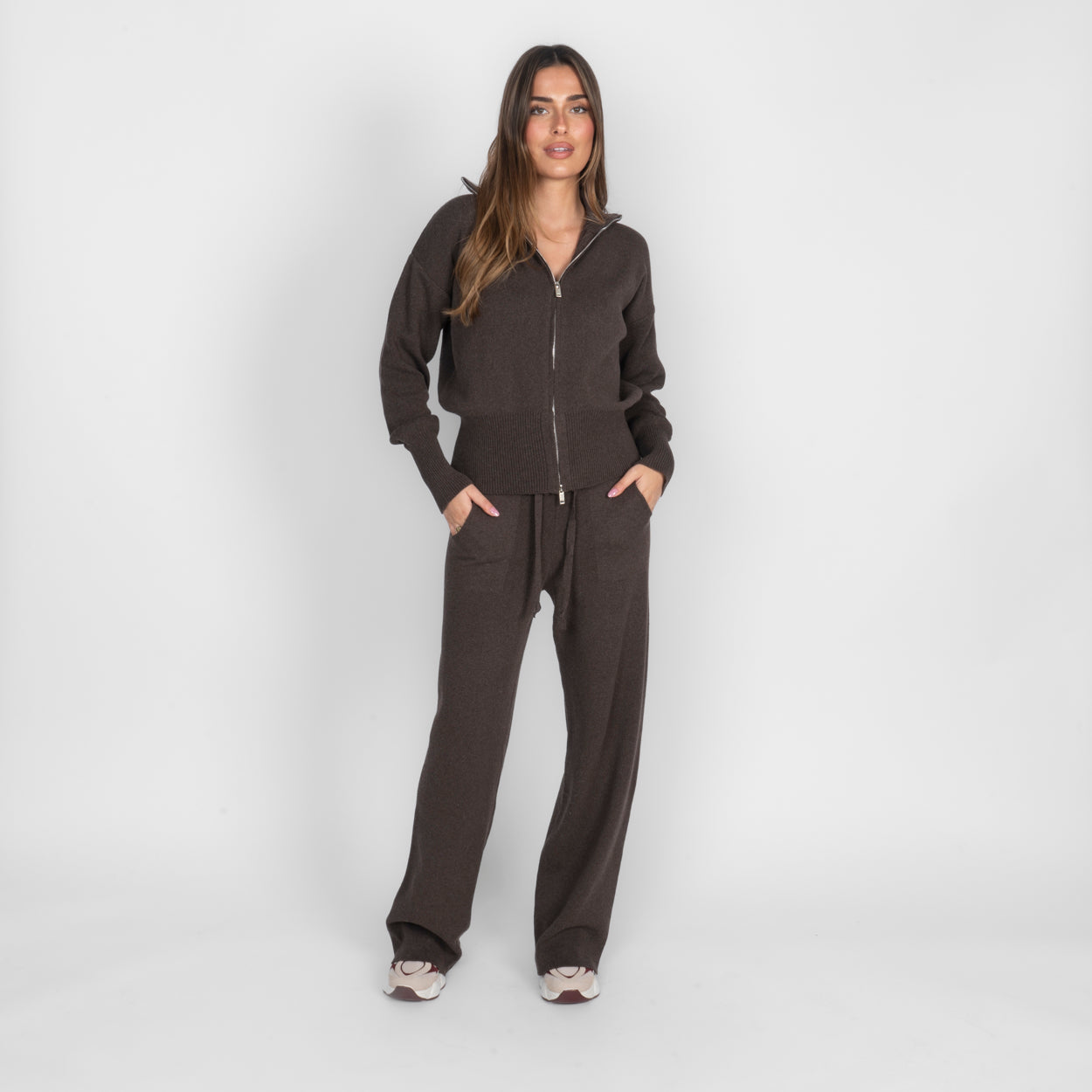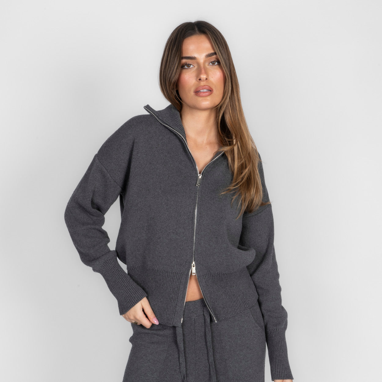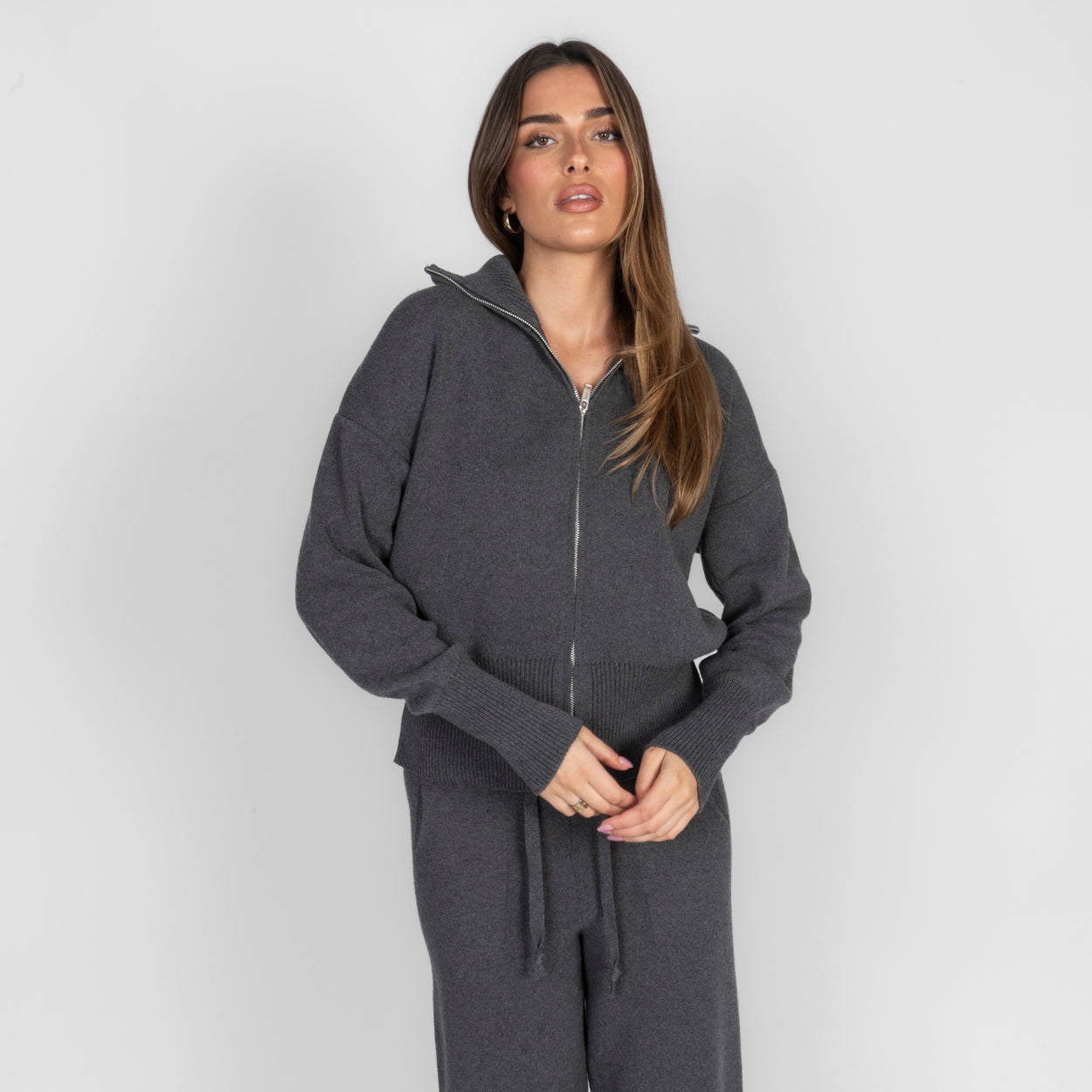 Unser Everyday Lounge Zweiteiler verbindet Komfort mit einem modernen, lässigen Look. Das Set besteht aus einer Strickjacke mit Reißverschluss und einer passenden Hose, die durch ihren lockeren Schnitt besonders bequem sitzt. Der weiche Strick fühlt sich angenehm auf der Haut an und macht das Set zum perfekten Begleiter für entspannte Tage.