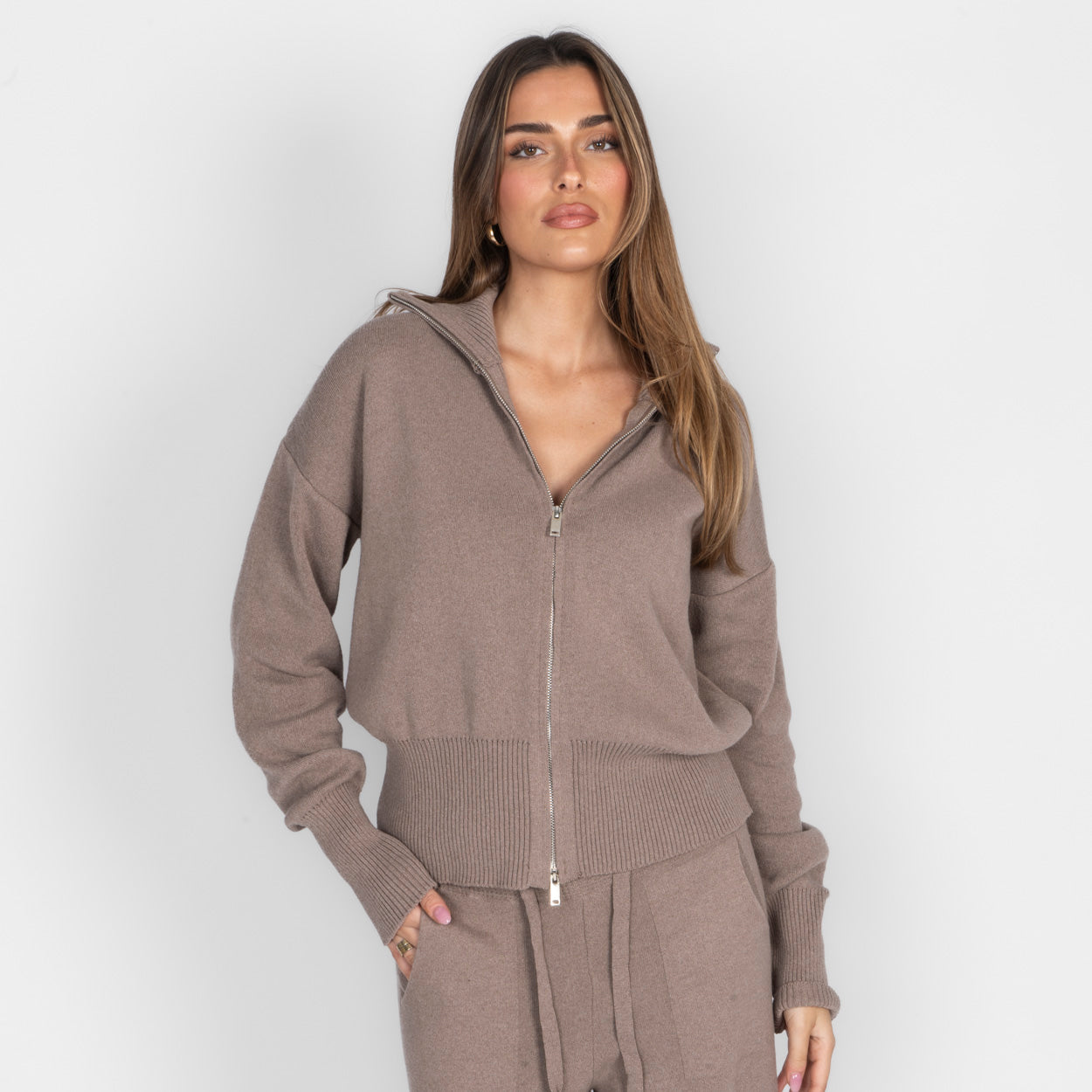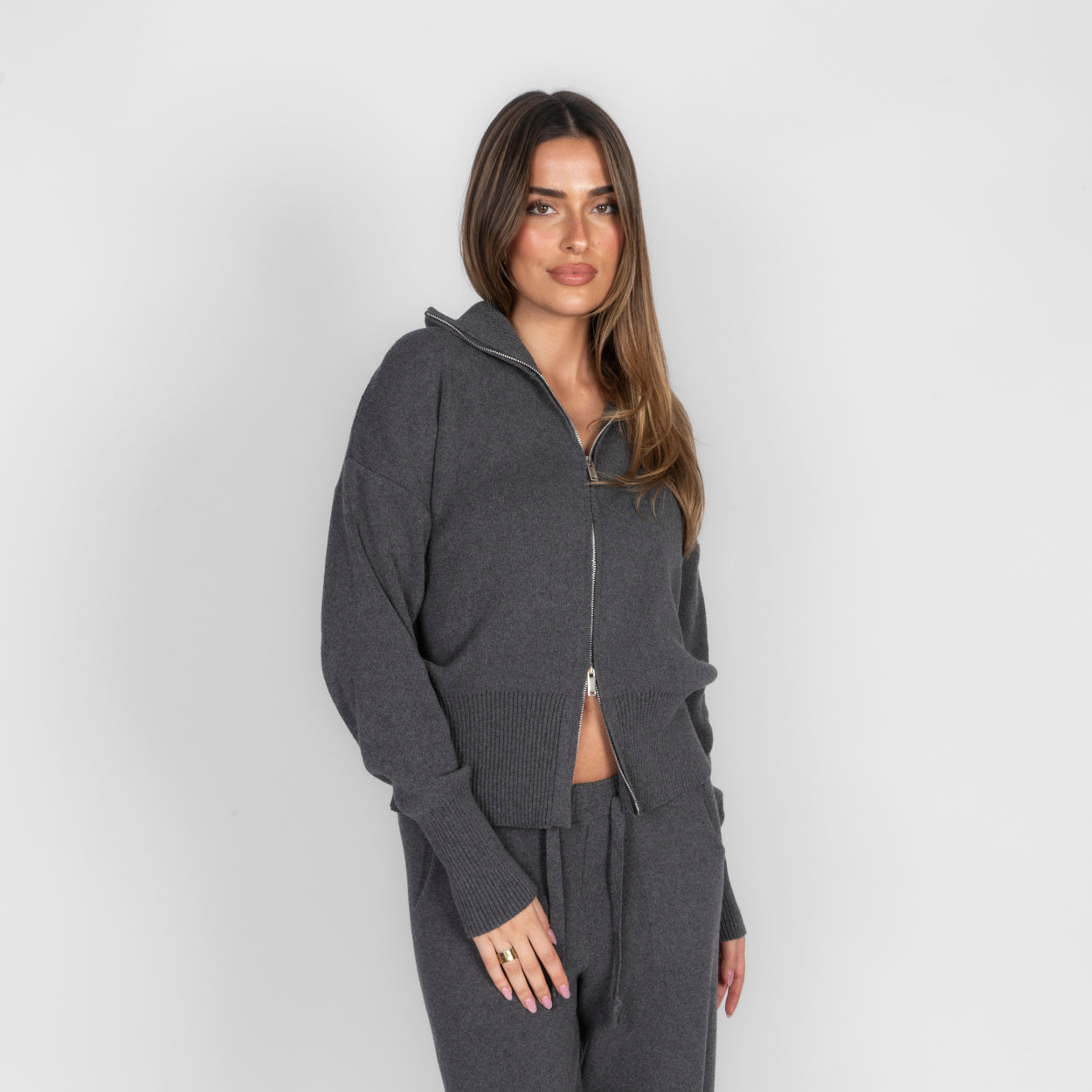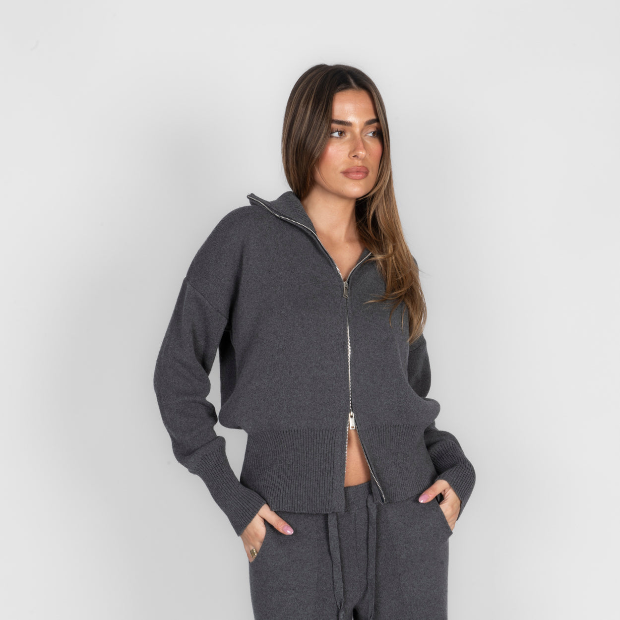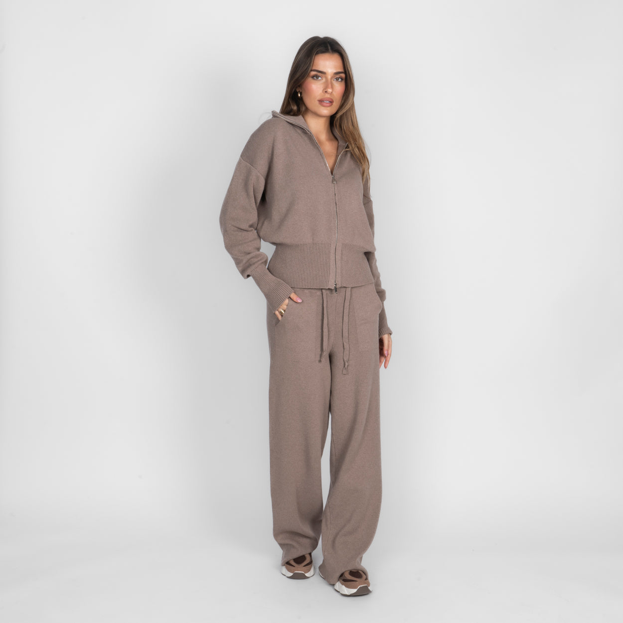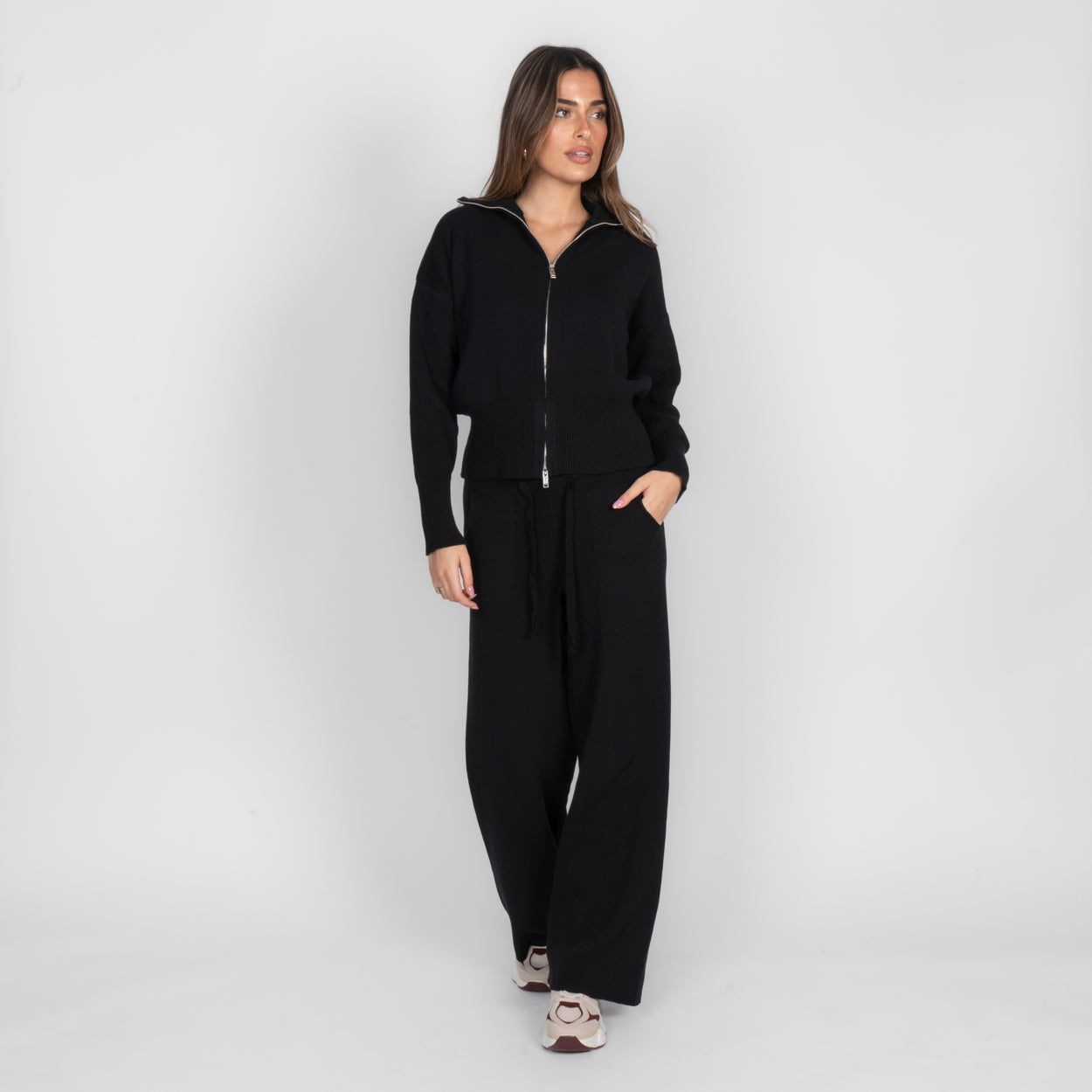 Unser Everyday Lounge Zweiteiler verbindet Komfort mit einem modernen, lässigen Look. Das Set besteht aus einer Strickjacke mit Reißverschluss und einer passenden Hose, die durch ihren lockeren Schnitt besonders bequem sitzt. Der weiche Strick fühlt sich angenehm auf der Haut an und macht das Set zum perfekten Begleiter für entspannte Tage.