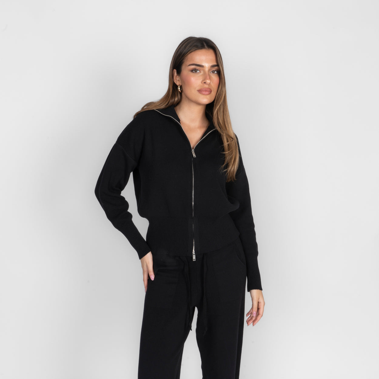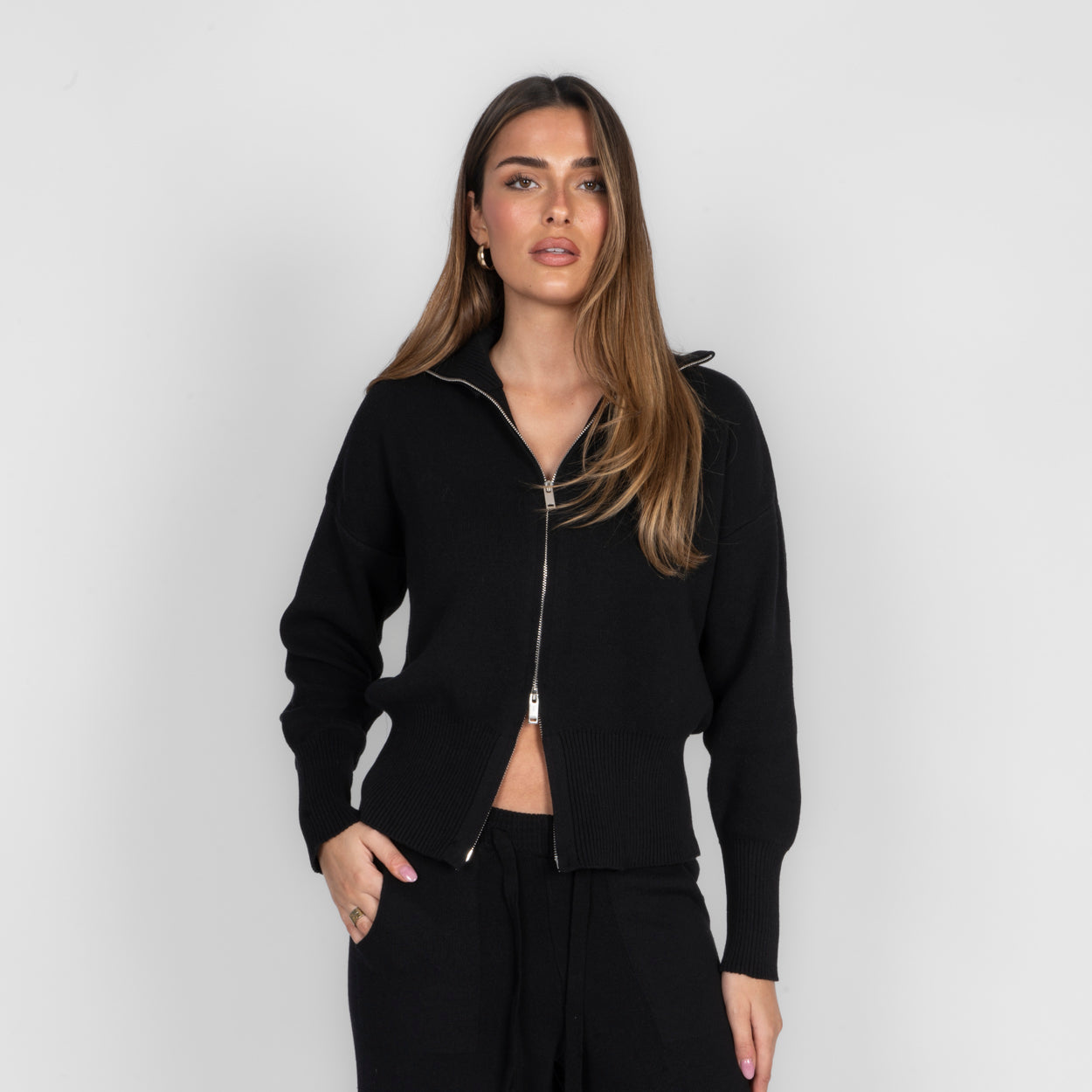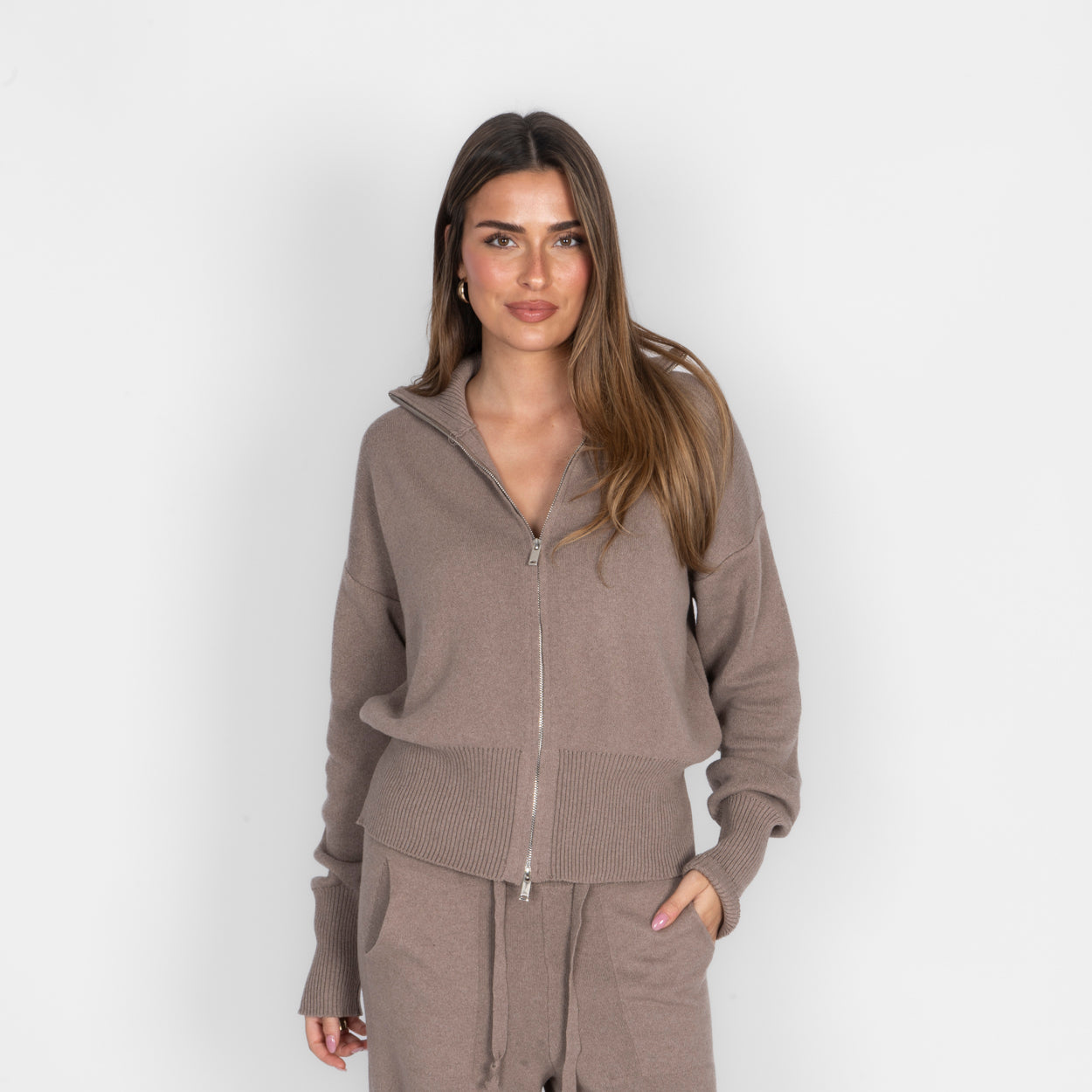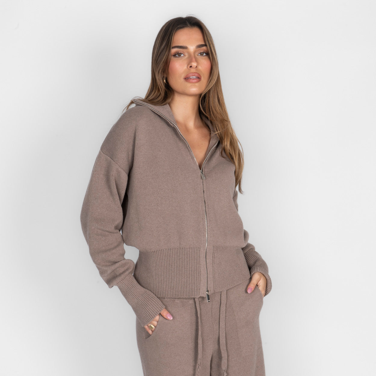 Unser Everyday Lounge Zweiteiler verbindet Komfort mit einem modernen, lässigen Look. Das Set besteht aus einer Strickjacke mit Reißverschluss und einer passenden Hose, die durch ihren lockeren Schnitt besonders bequem sitzt. Der weiche Strick fühlt sich angenehm auf der Haut an und macht das Set zum perfekten Begleiter für entspannte Tage.