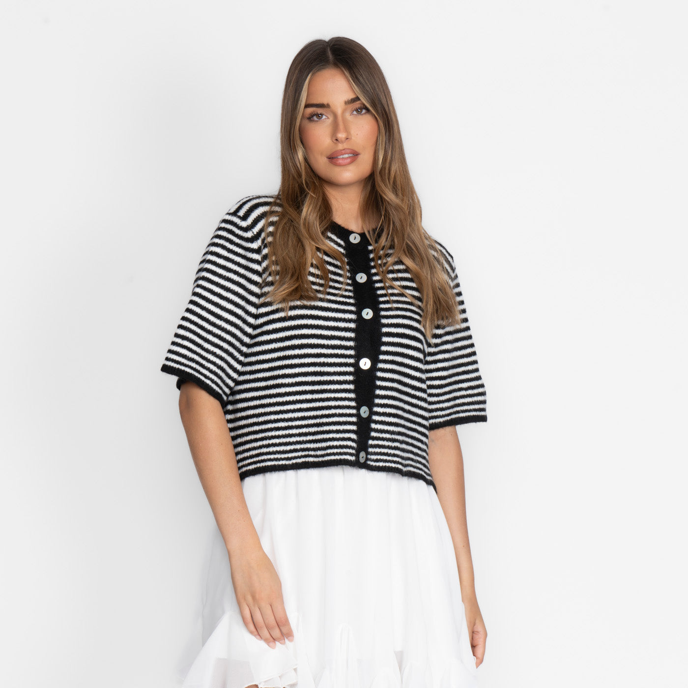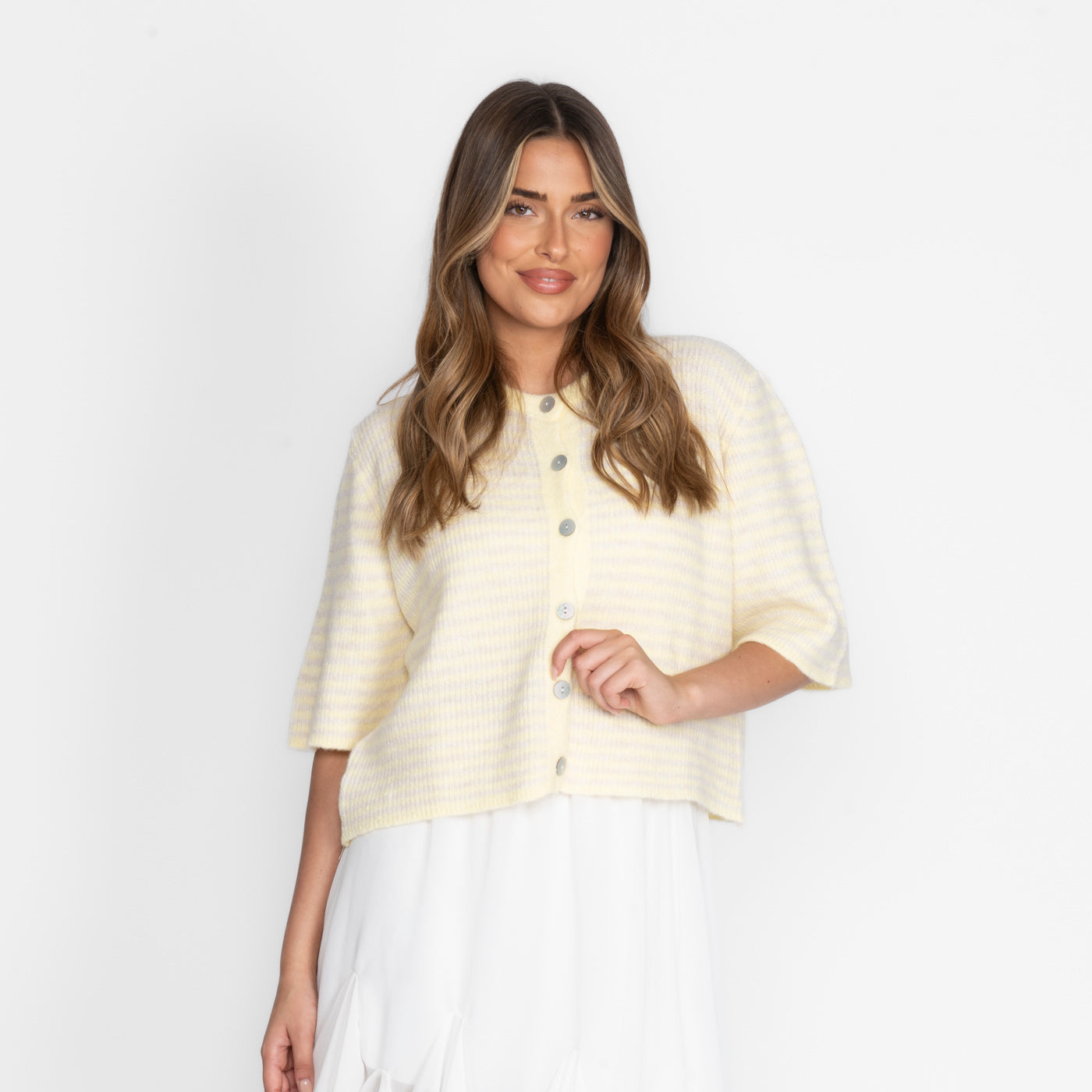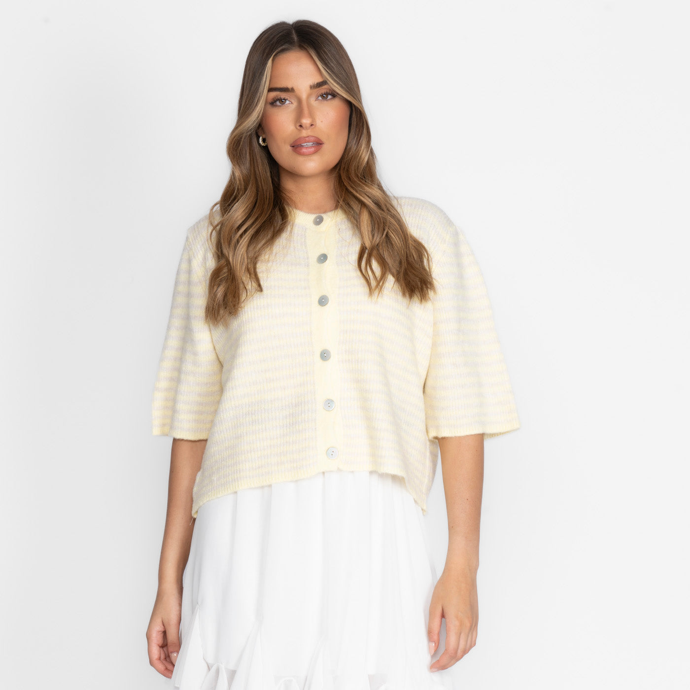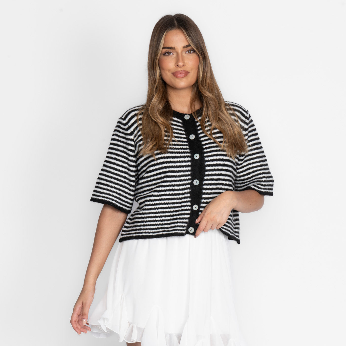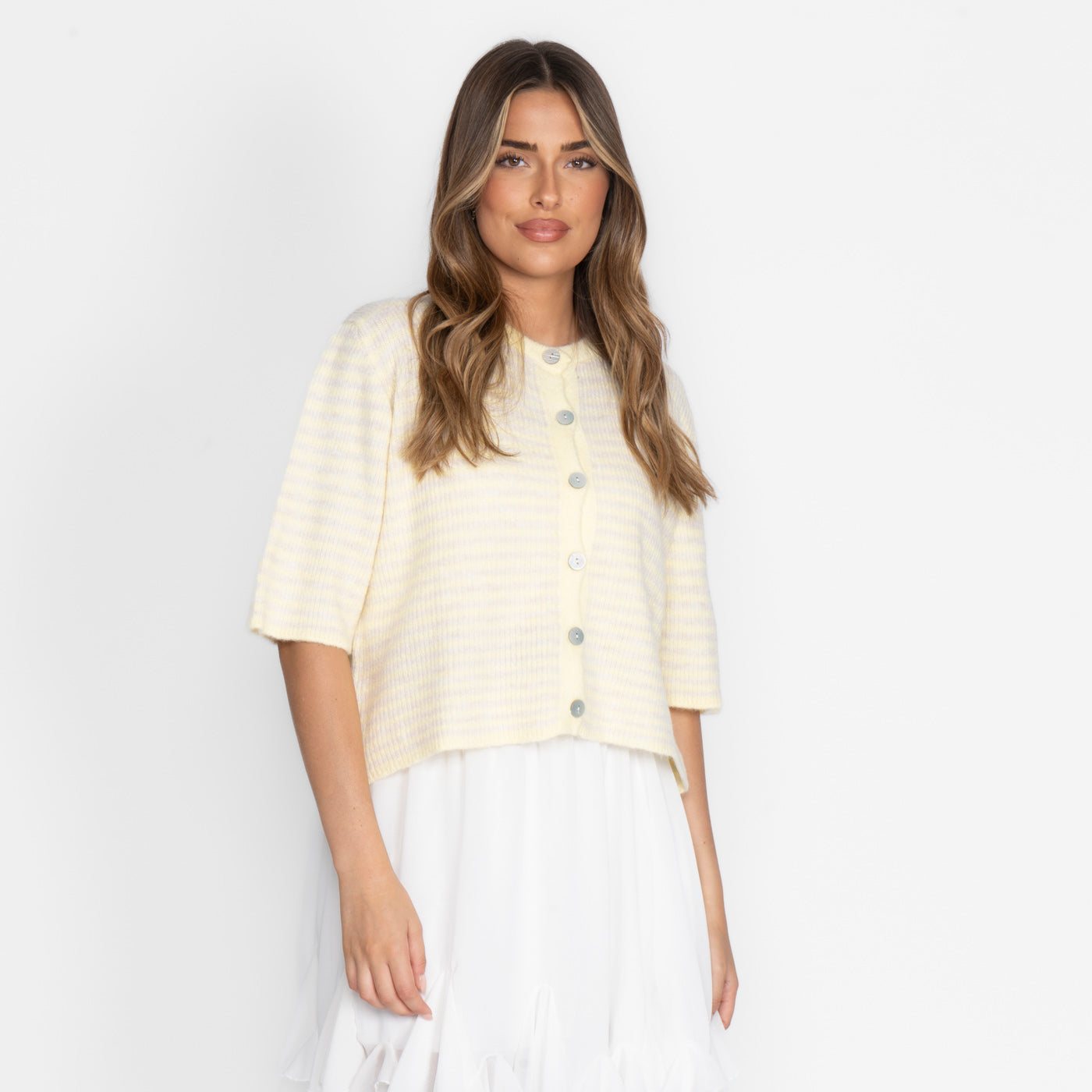 Ein Must-have für alle, die lässige Leichtigkeit mit stilvollem Strick kombinieren möchten: Unser Kurzarm-Strickcardigan mit Knopfleiste überzeugt durch seinen entspannten Boxy Fit, weichen Rippstrick und charmante Details. Die halblangen Ärmel und die dezente Cropped-Länge machen ihn zum perfekten Begleiter für warme Tage – ob offen über einem Top oder geschlossen als Statement-Piece getragen.