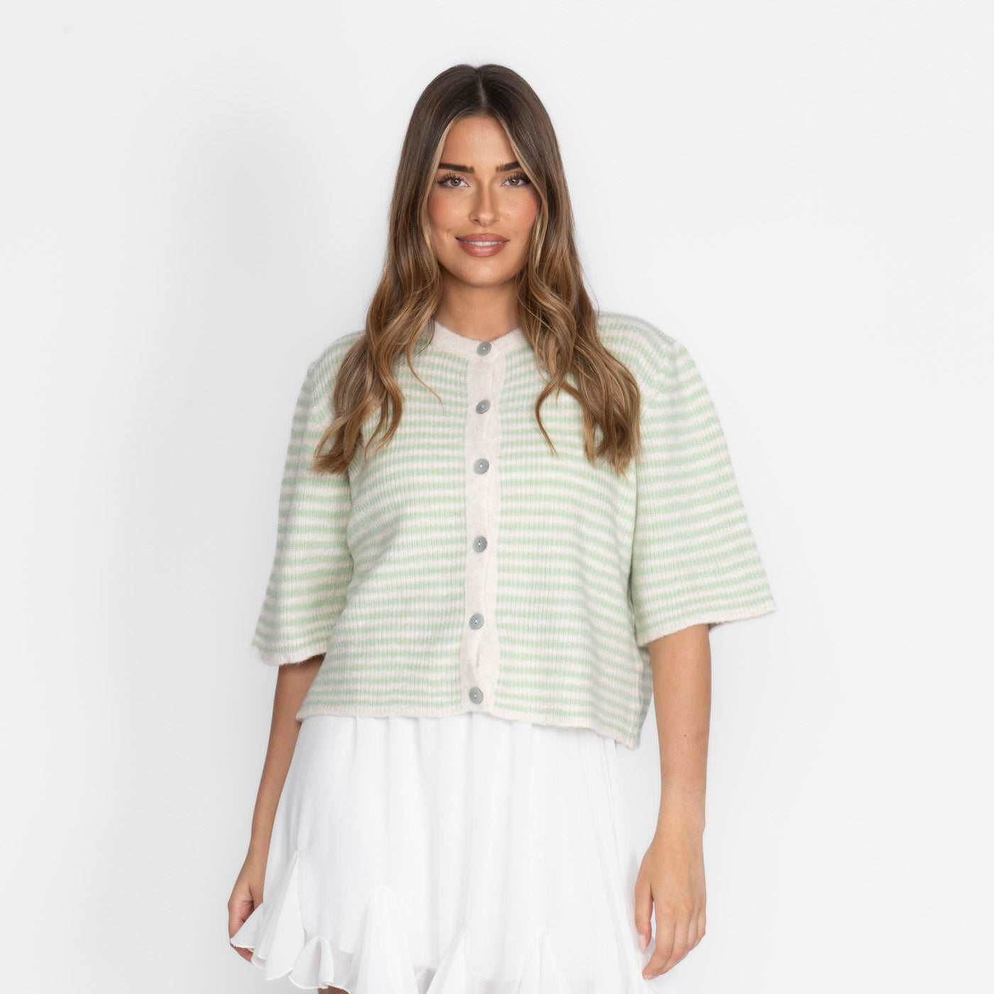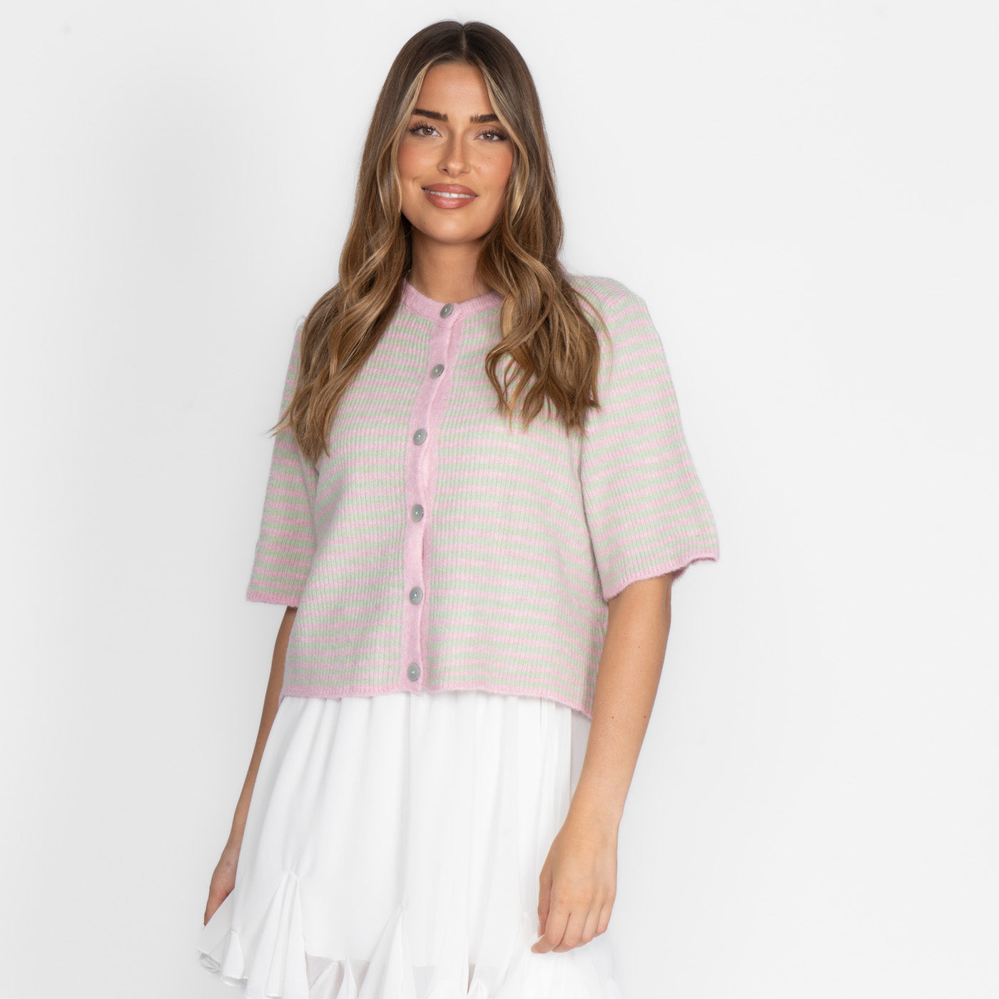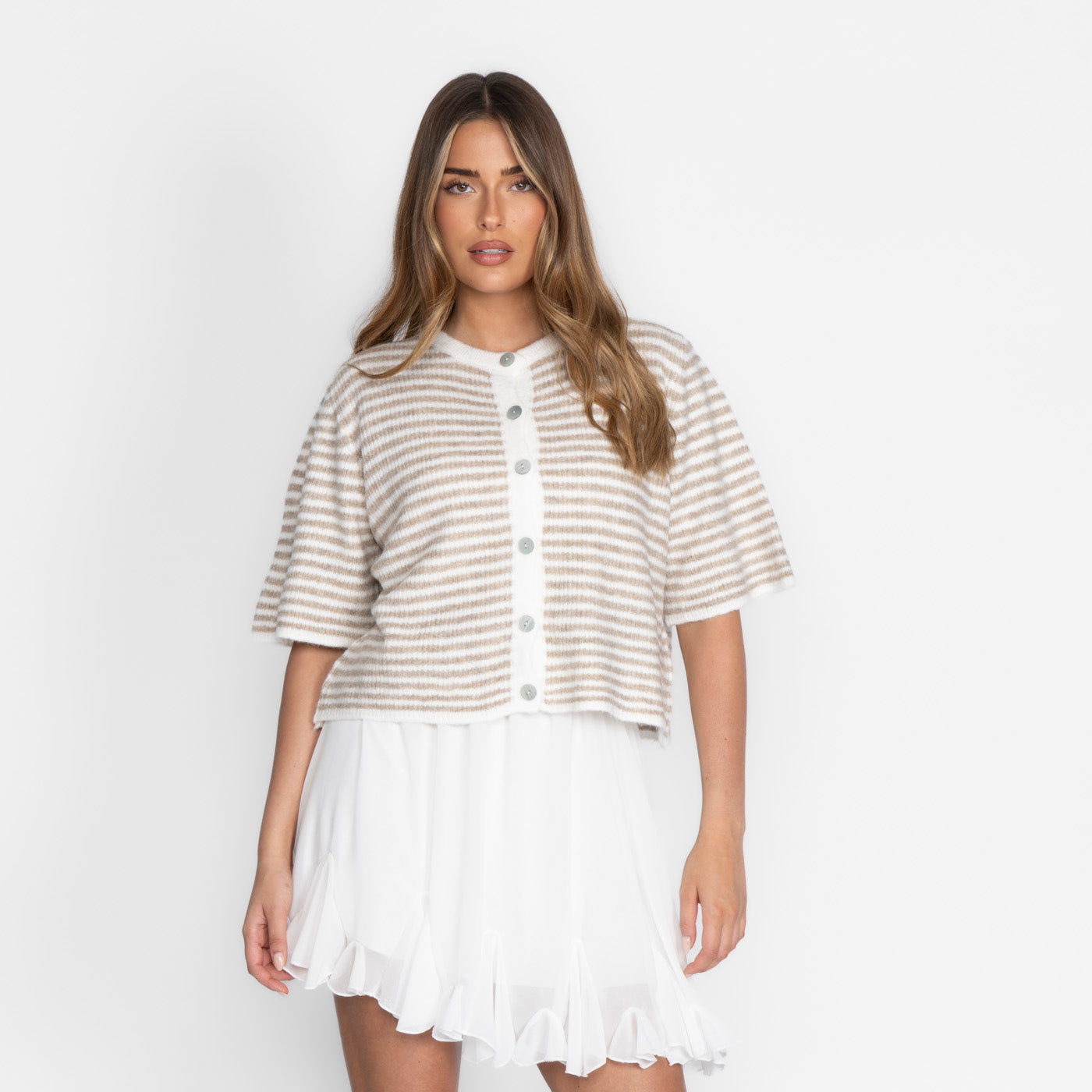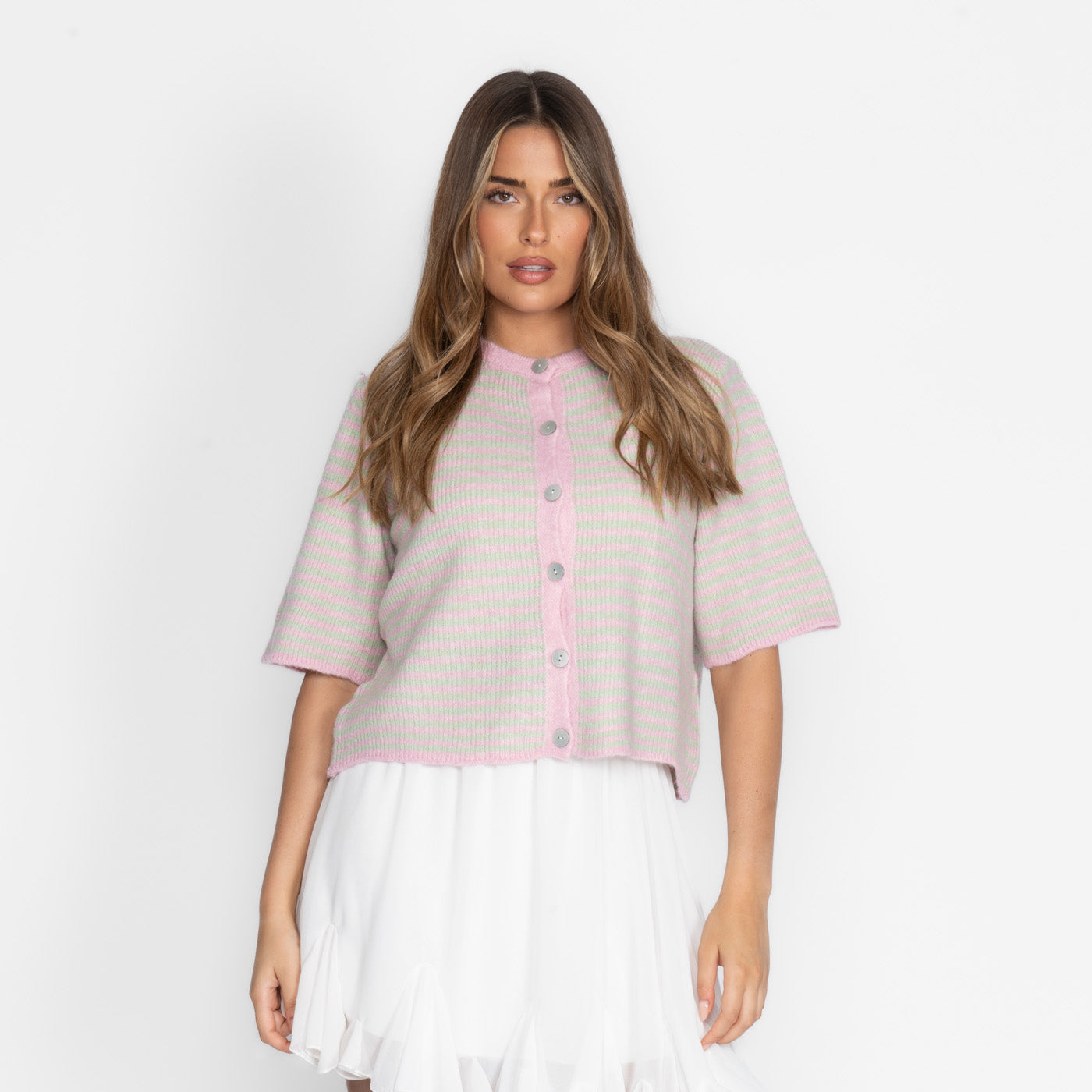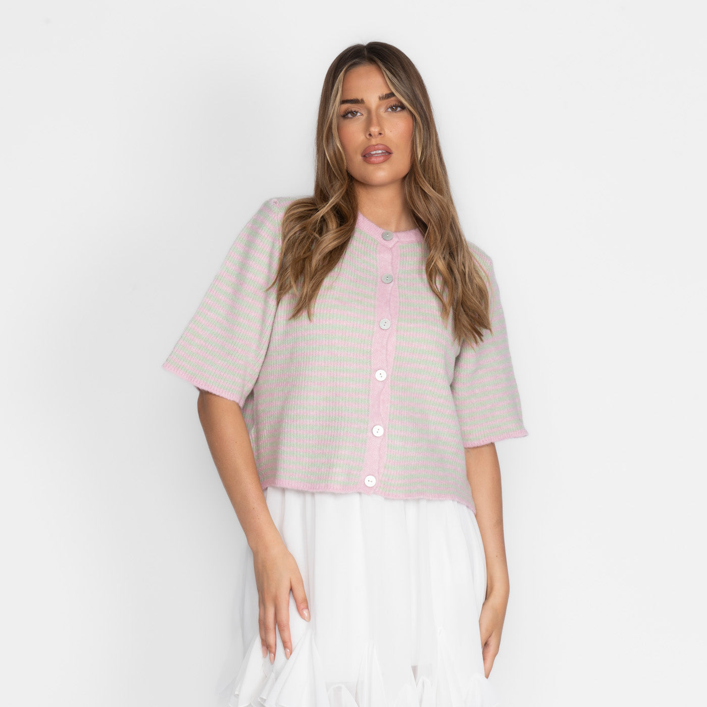 Ein Must-have für alle, die lässige Leichtigkeit mit stilvollem Strick kombinieren möchten: Unser Kurzarm-Strickcardigan mit Knopfleiste überzeugt durch seinen entspannten Boxy Fit, weichen Rippstrick und charmante Details. Die halblangen Ärmel und die dezente Cropped-Länge machen ihn zum perfekten Begleiter für warme Tage – ob offen über einem Top oder geschlossen als Statement-Piece getragen.