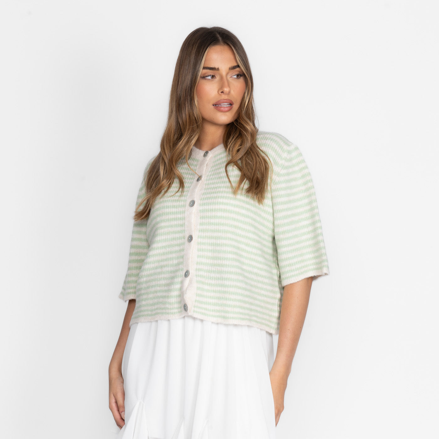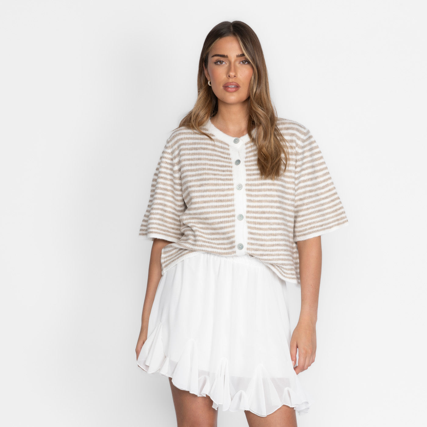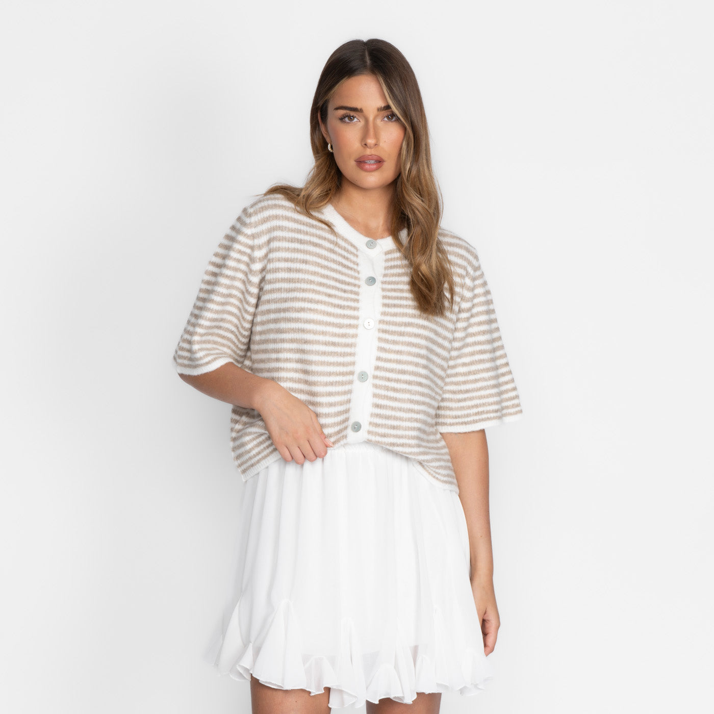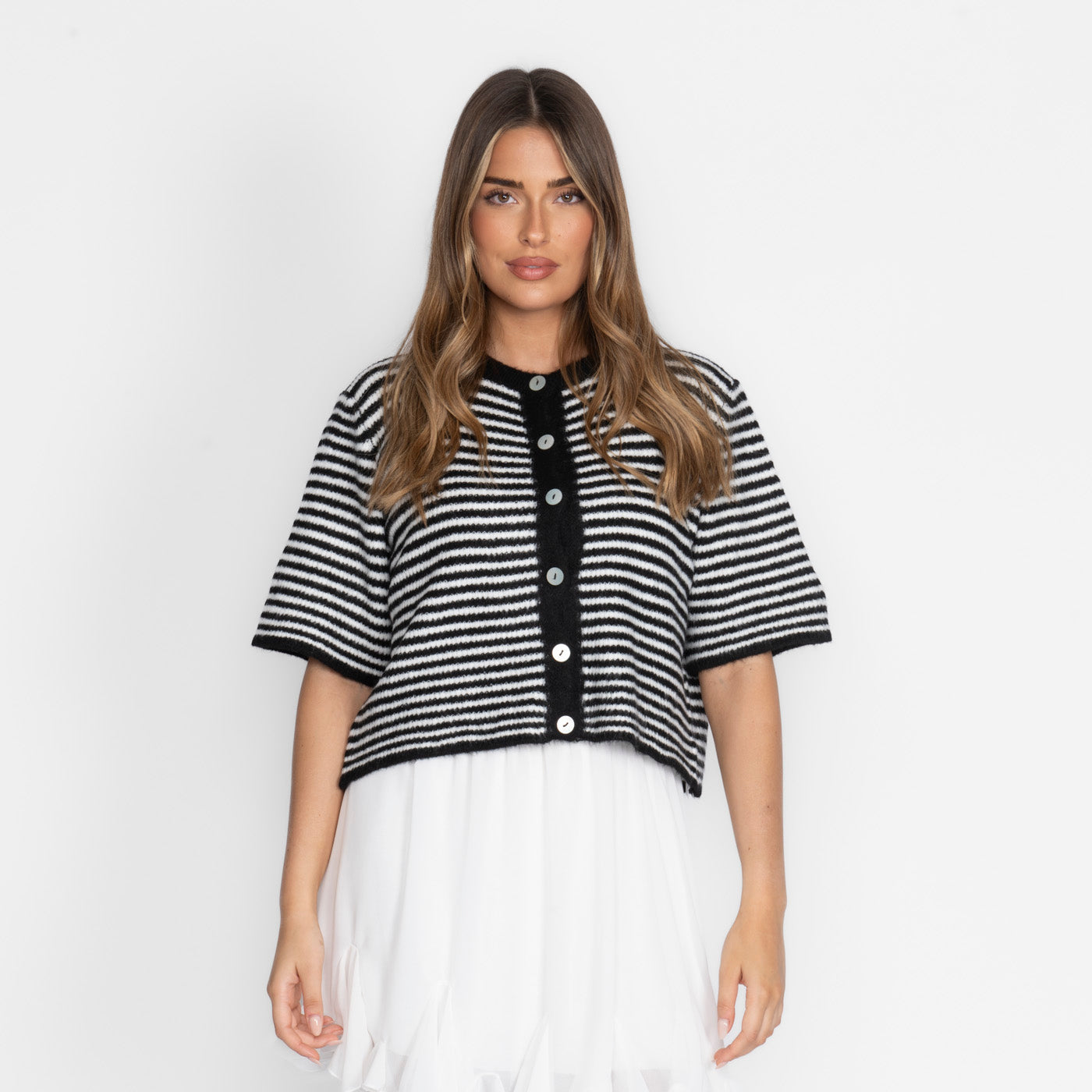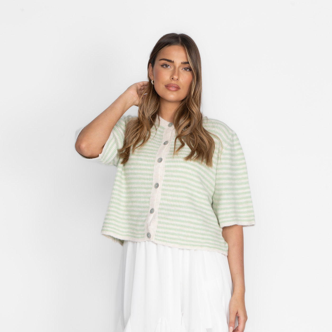 Ein Must-have für alle, die lässige Leichtigkeit mit stilvollem Strick kombinieren möchten: Unser Kurzarm-Strickcardigan mit Knopfleiste überzeugt durch seinen entspannten Boxy Fit, weichen Rippstrick und charmante Details. Die halblangen Ärmel und die dezente Cropped-Länge machen ihn zum perfekten Begleiter für warme Tage – ob offen über einem Top oder geschlossen als Statement-Piece getragen.