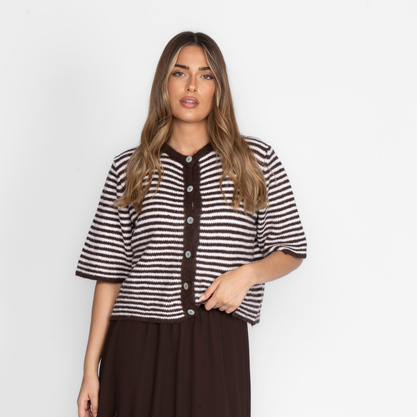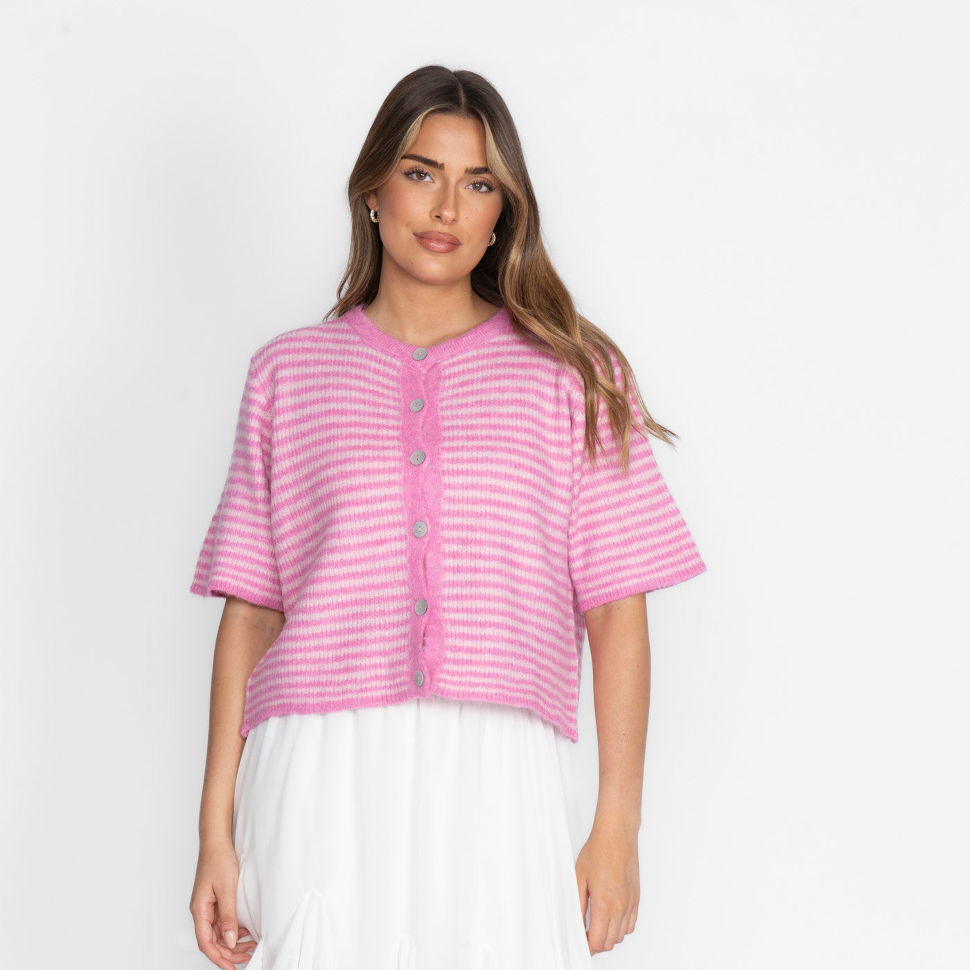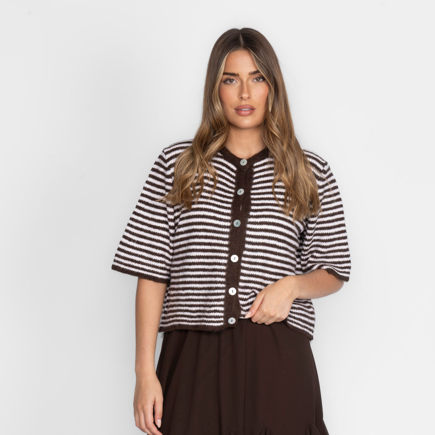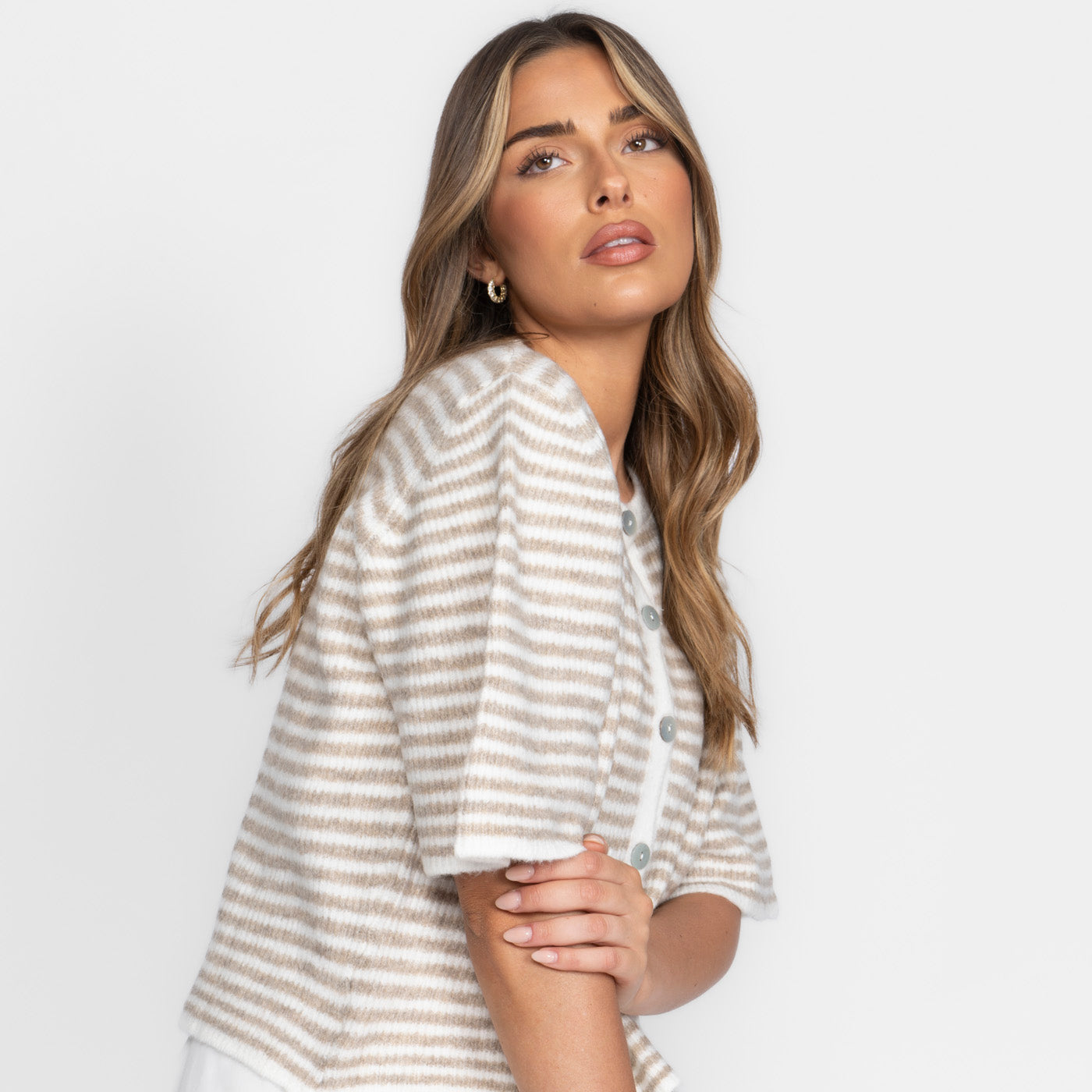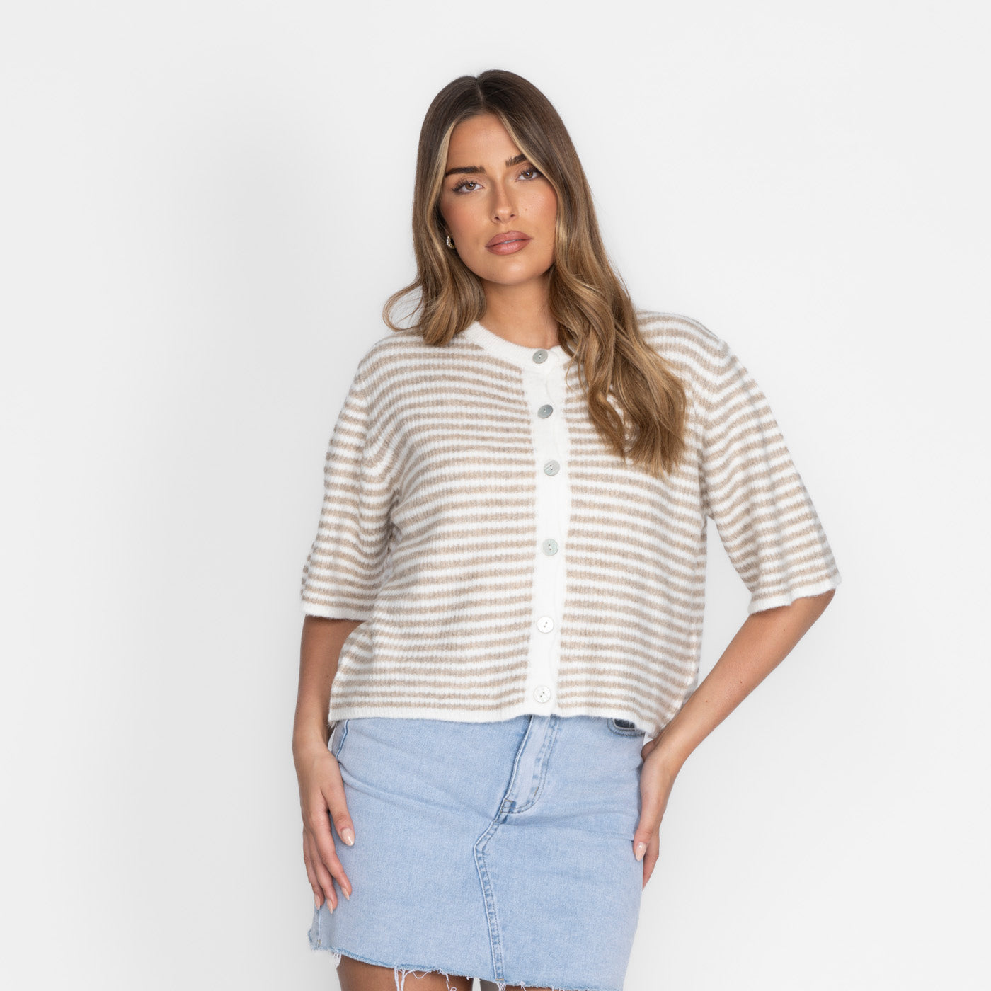 Ein Must-have für alle, die lässige Leichtigkeit mit stilvollem Strick kombinieren möchten: Unser Kurzarm-Strickcardigan mit Knopfleiste überzeugt durch seinen entspannten Boxy Fit, weichen Rippstrick und charmante Details. Die halblangen Ärmel und die dezente Cropped-Länge machen ihn zum perfekten Begleiter für warme Tage – ob offen über einem Top oder geschlossen als Statement-Piece getragen.