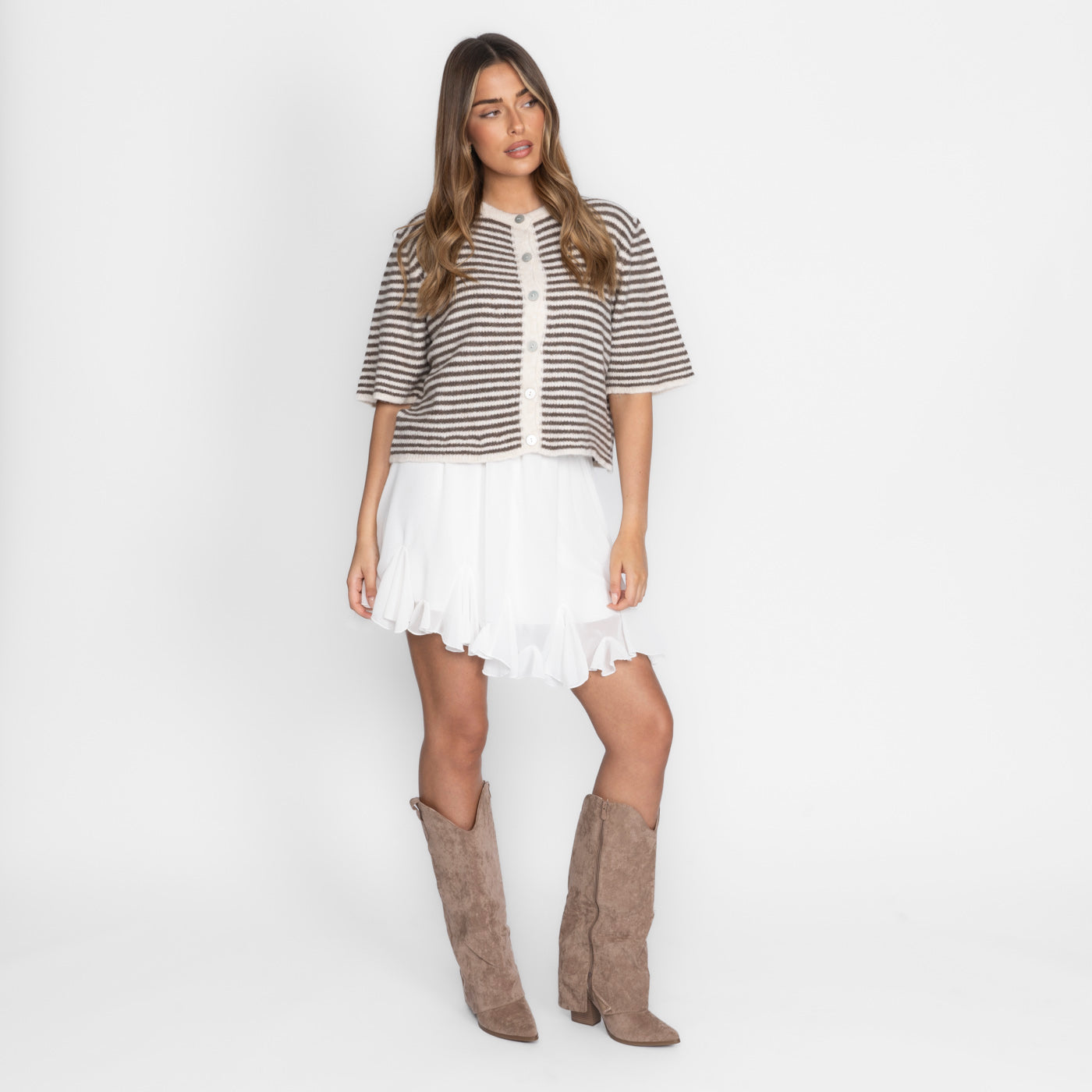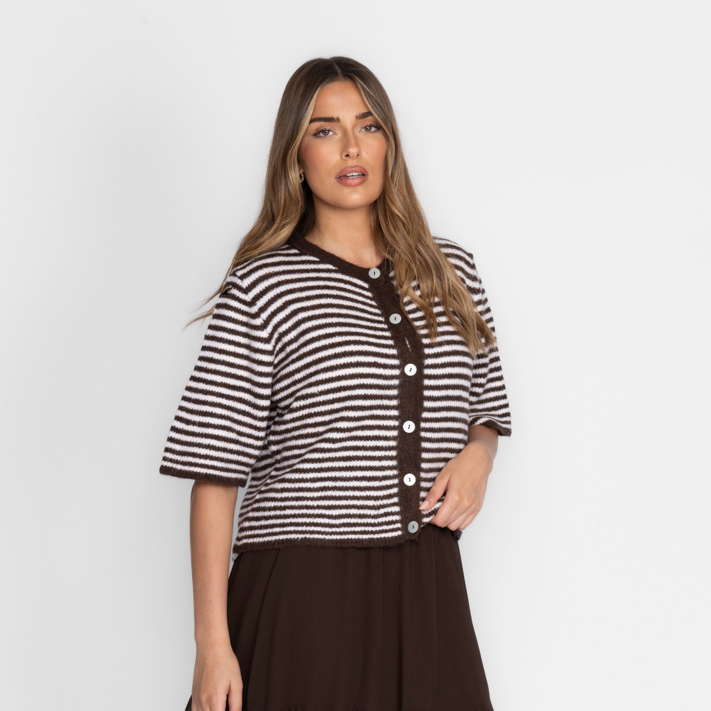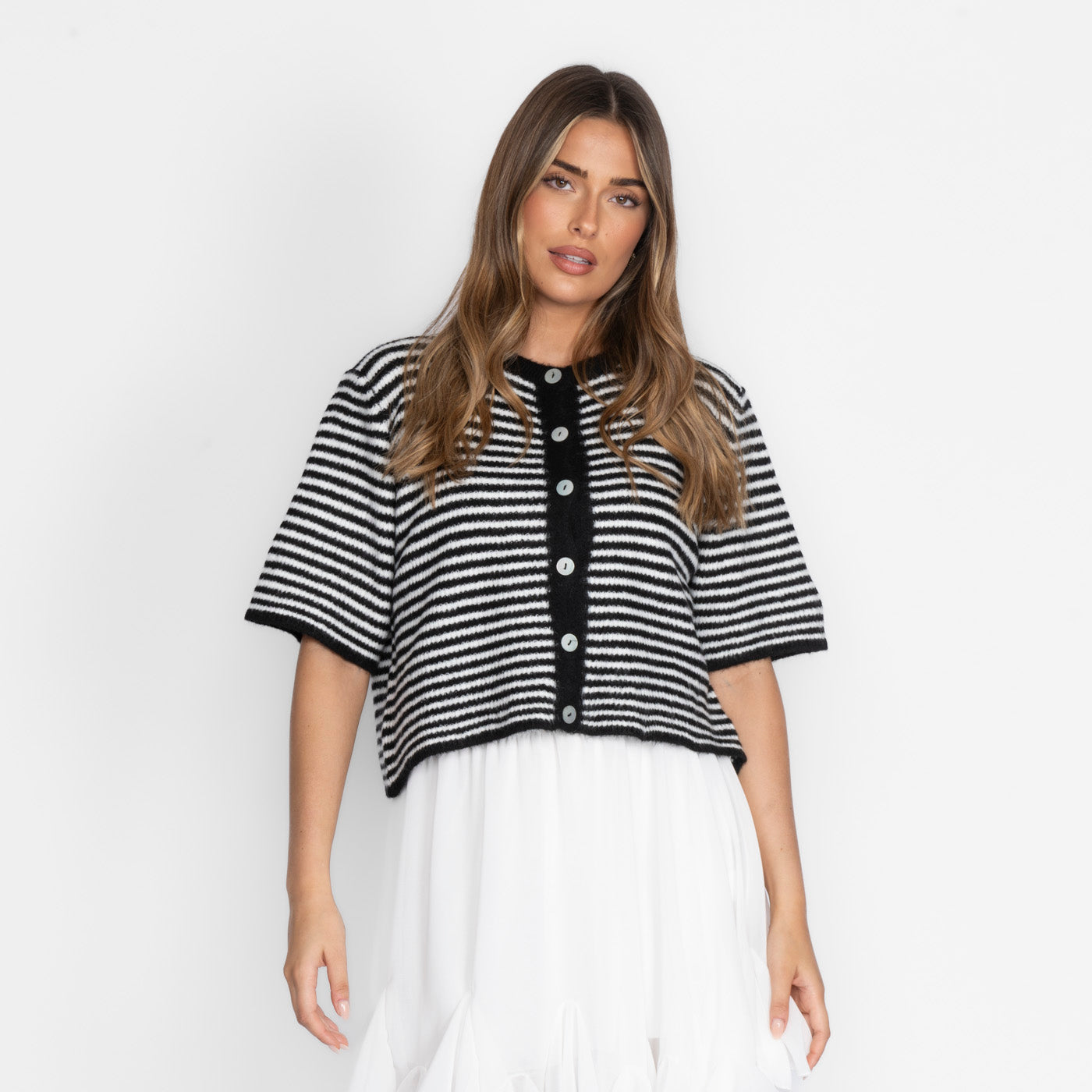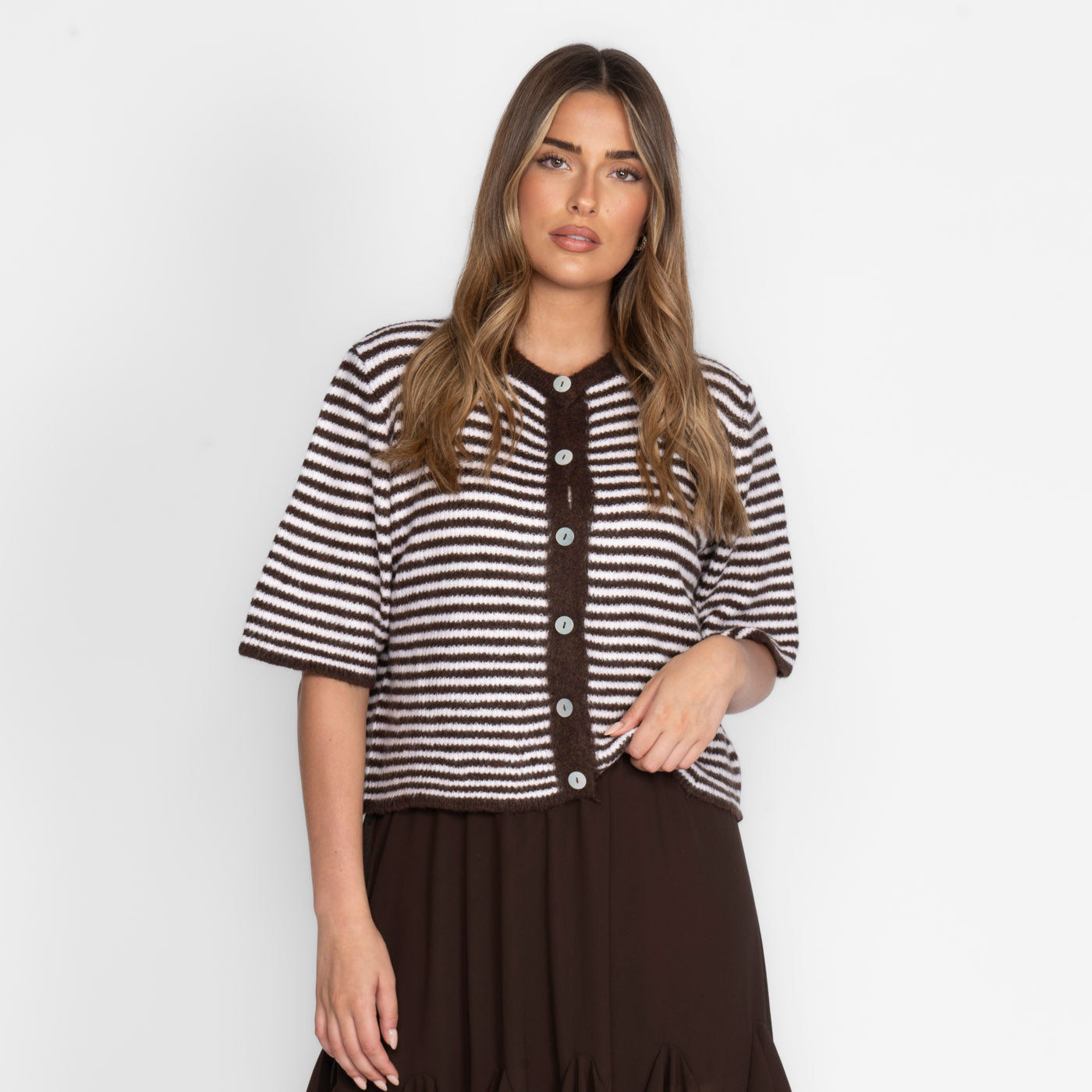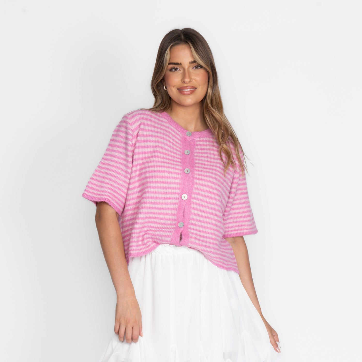 Ein Must-have für alle, die lässige Leichtigkeit mit stilvollem Strick kombinieren möchten: Unser Kurzarm-Strickcardigan mit Knopfleiste überzeugt durch seinen entspannten Boxy Fit, weichen Rippstrick und charmante Details. Die halblangen Ärmel und die dezente Cropped-Länge machen ihn zum perfekten Begleiter für warme Tage – ob offen über einem Top oder geschlossen als Statement-Piece getragen.