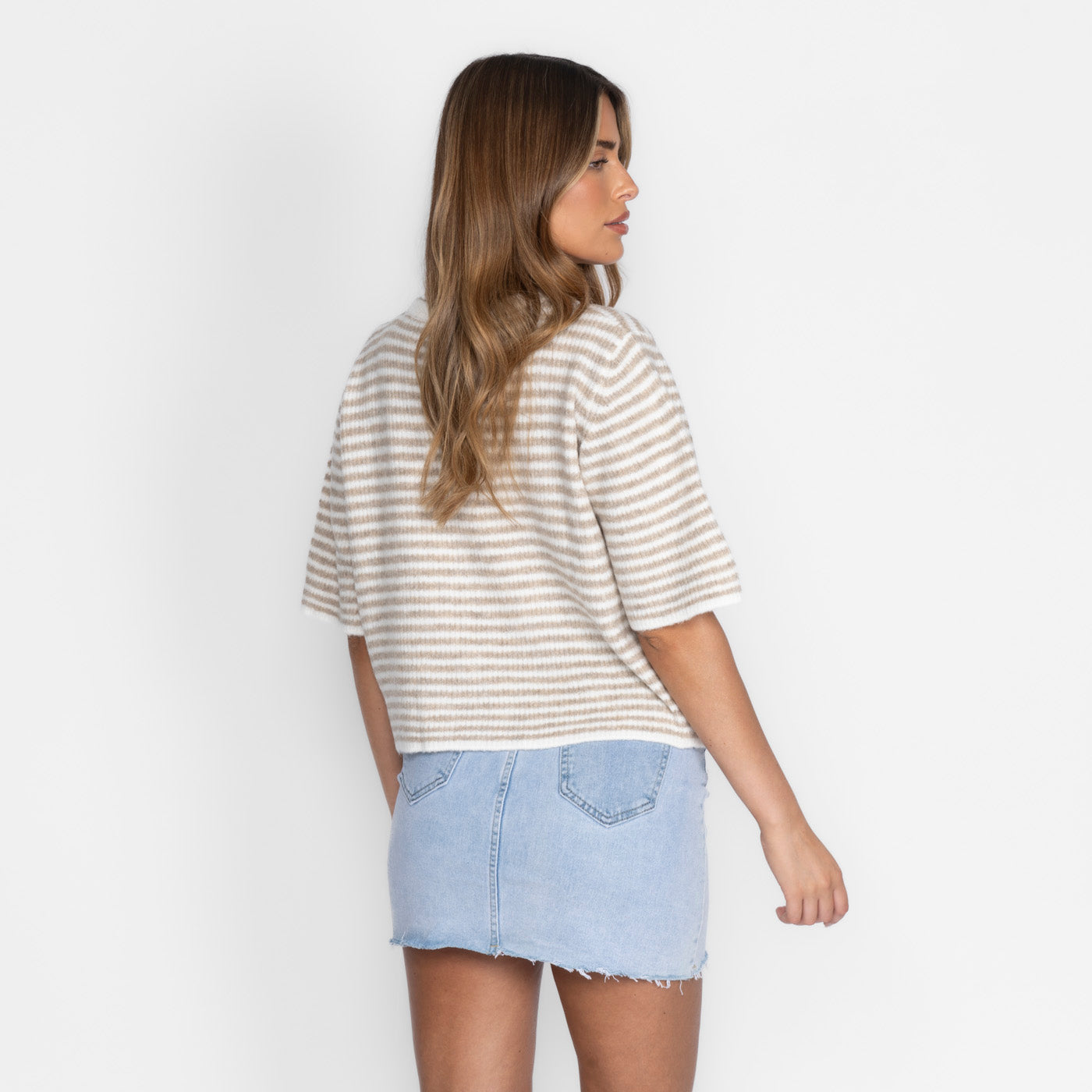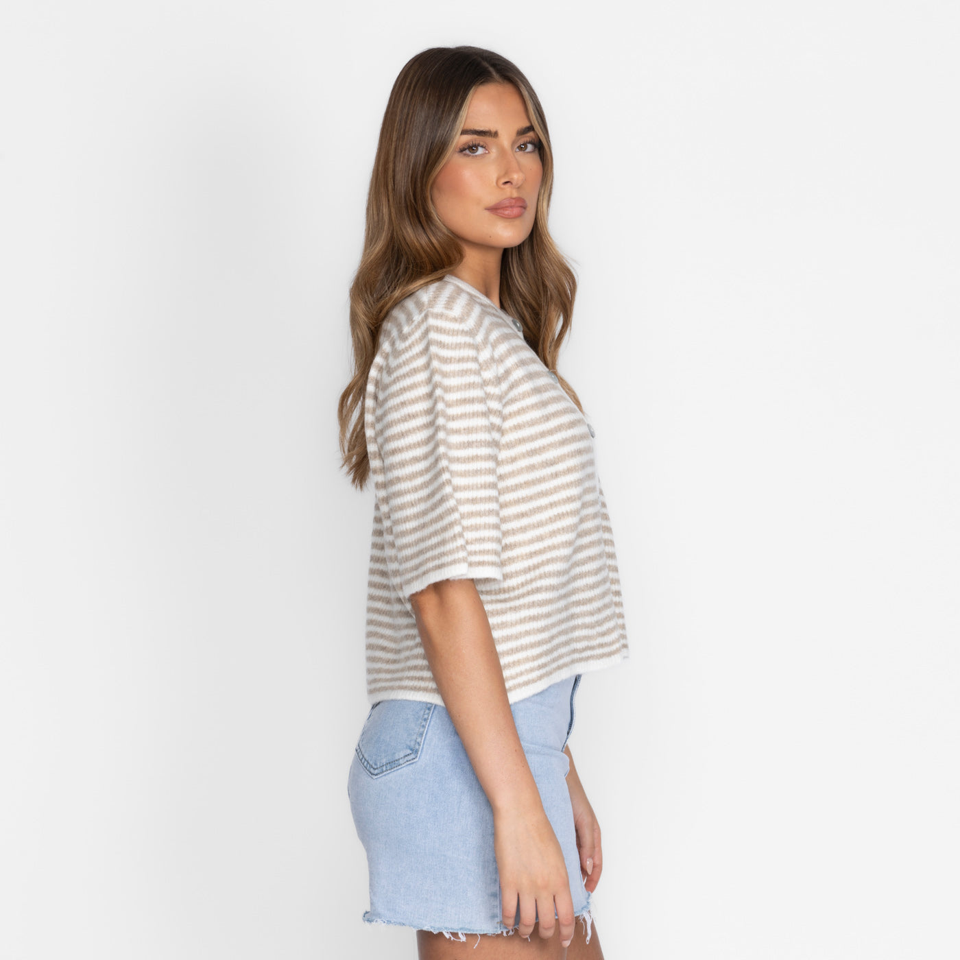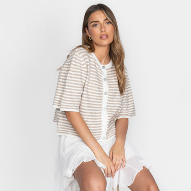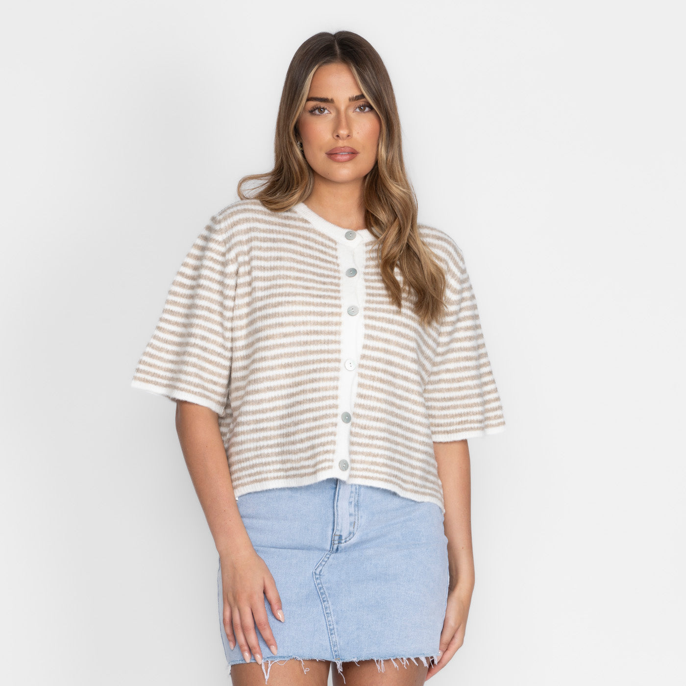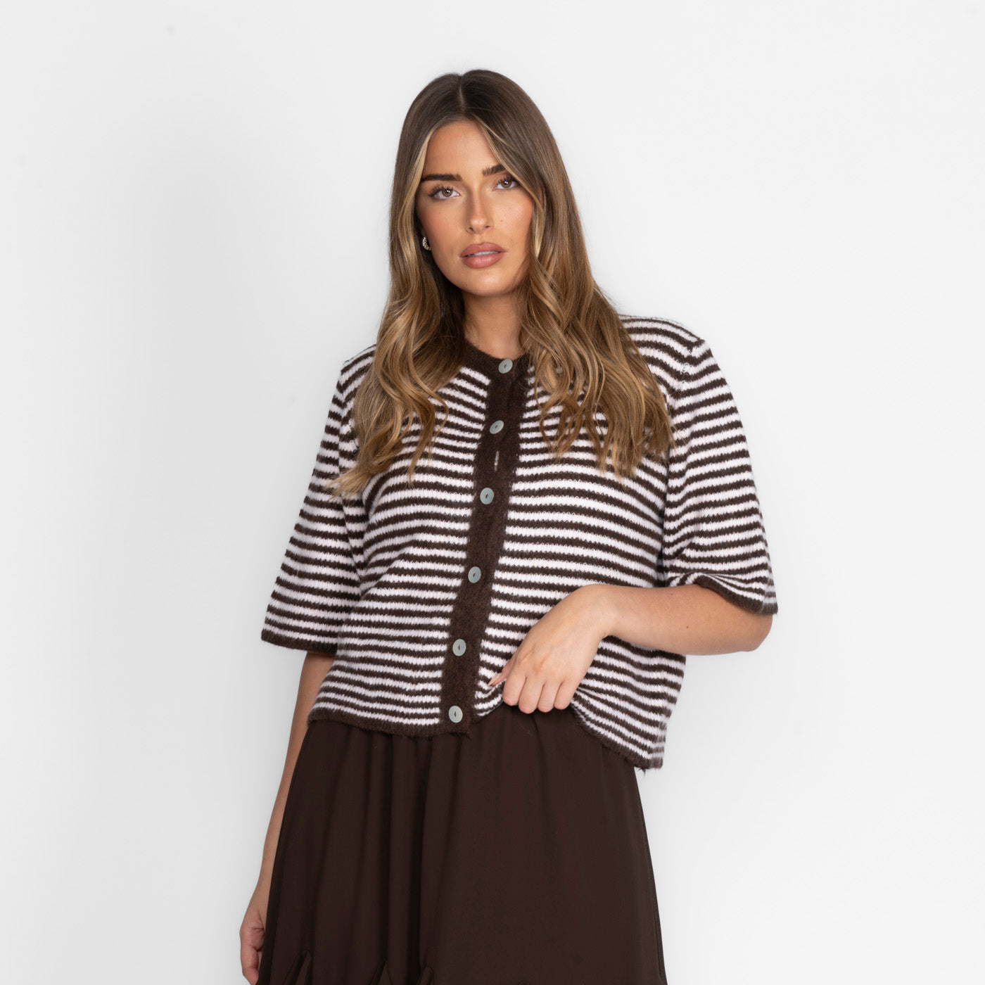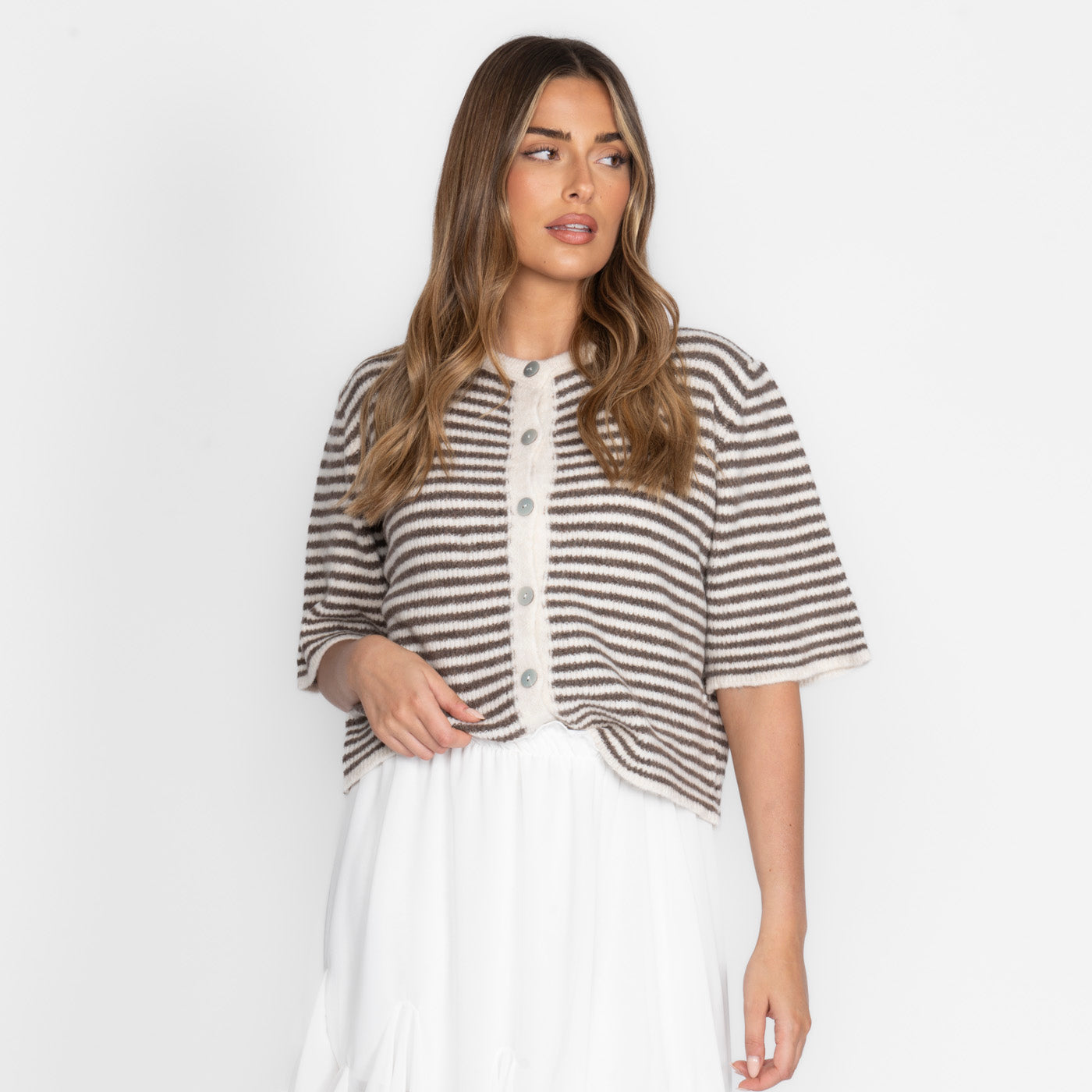 Ein Must-have für alle, die lässige Leichtigkeit mit stilvollem Strick kombinieren möchten: Unser Kurzarm-Strickcardigan mit Knopfleiste überzeugt durch seinen entspannten Boxy Fit, weichen Rippstrick und charmante Details. Die halblangen Ärmel und die dezente Cropped-Länge machen ihn zum perfekten Begleiter für warme Tage – ob offen über einem Top oder geschlossen als Statement-Piece getragen.