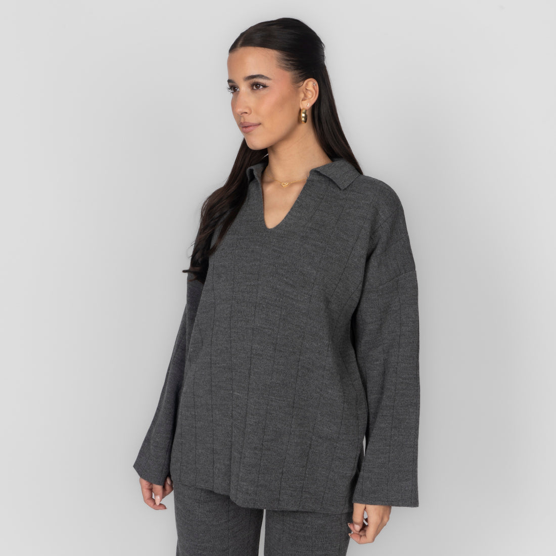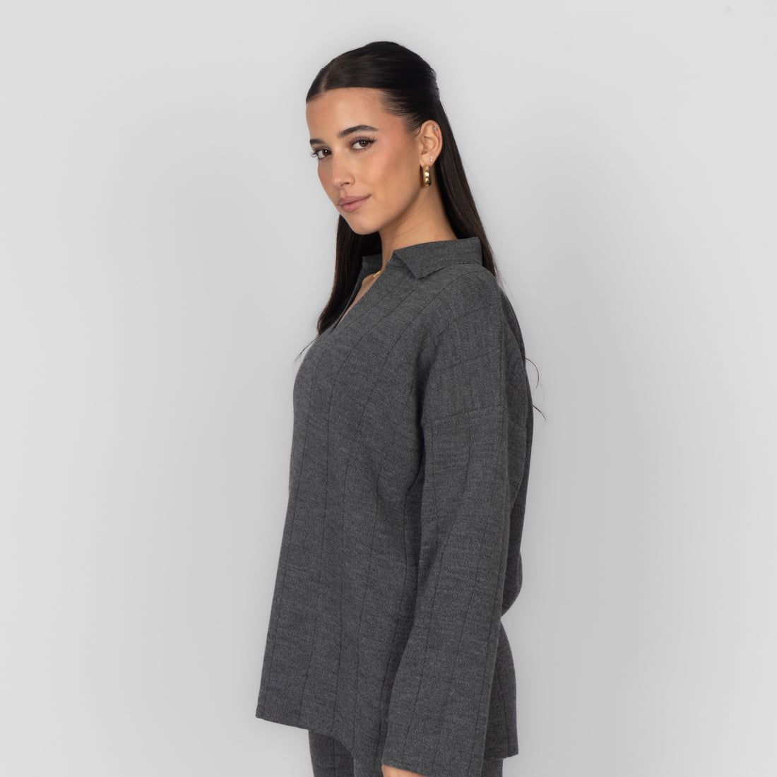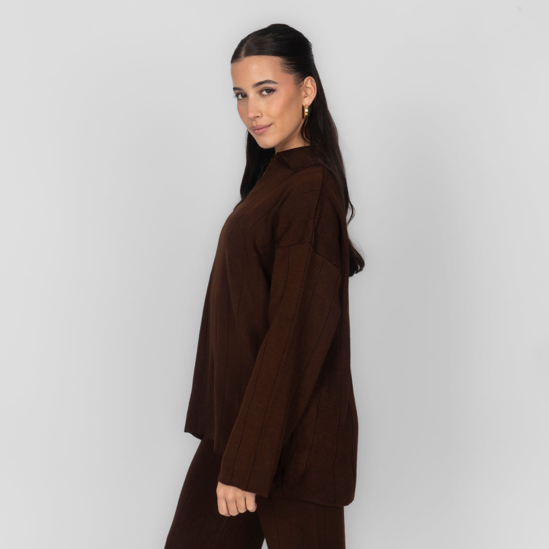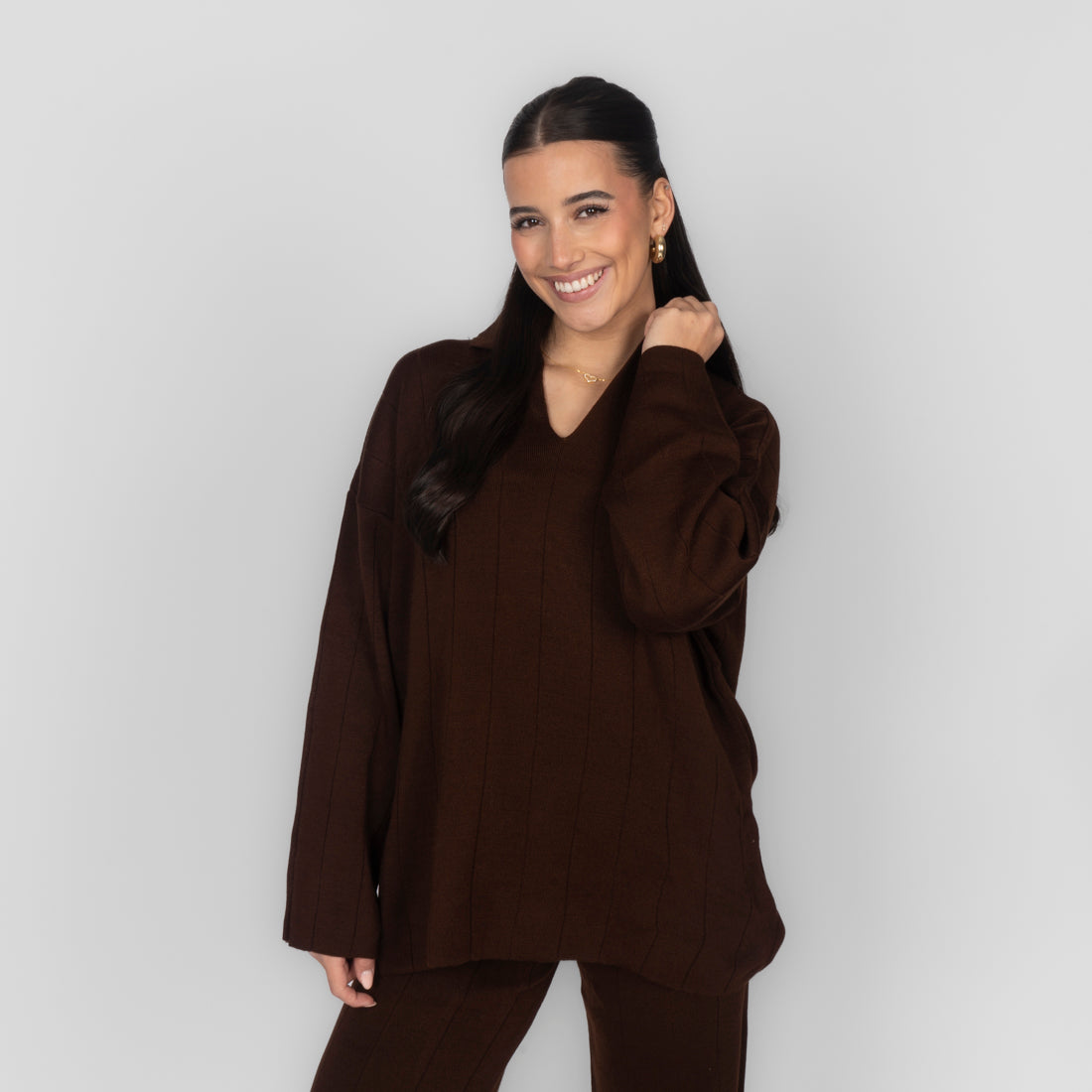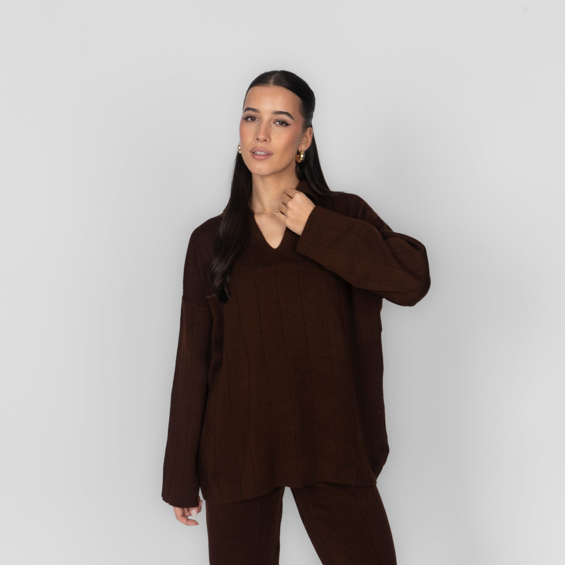 Unser V-Ausschnitt Rippstrick Oberteil besteht aus einem locker geschnittenen Oberteil mit schmeichelndem V-Ausschnitt.
