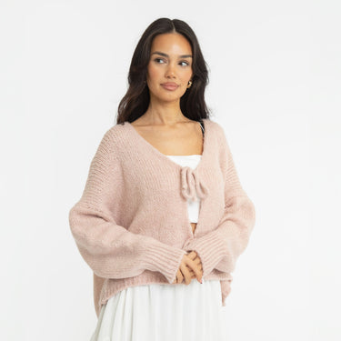 Die romantischen Schleifendetails auf der Vorderseite betonen den eleganten V-Ausschnitt und machen den Cardigan zu einem einzigartigen Hingucker. Der lockere Schnitt und das flauschige Material sorgen für ein angenehmes Tragegefühl – ideal für den Alltag oder besondere Anlässe.